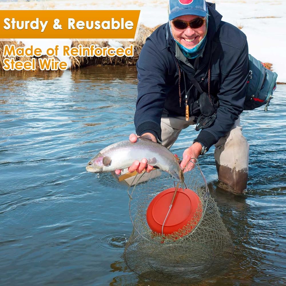 • 🐟🐟【Durable Material】All the fram constructed of fishing basket is tough steel wire,which ensures extra strength to resist rust and corrosion.All hinges are reinforced to stand up to the repeated use.Handmade fishing baskets,there may be slight differences in the color of the metal fish basket, please understand.