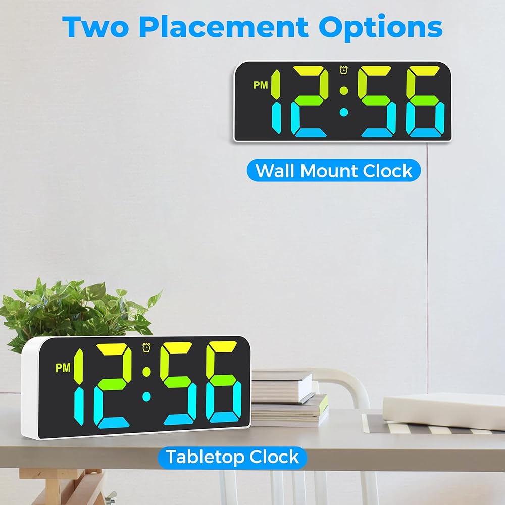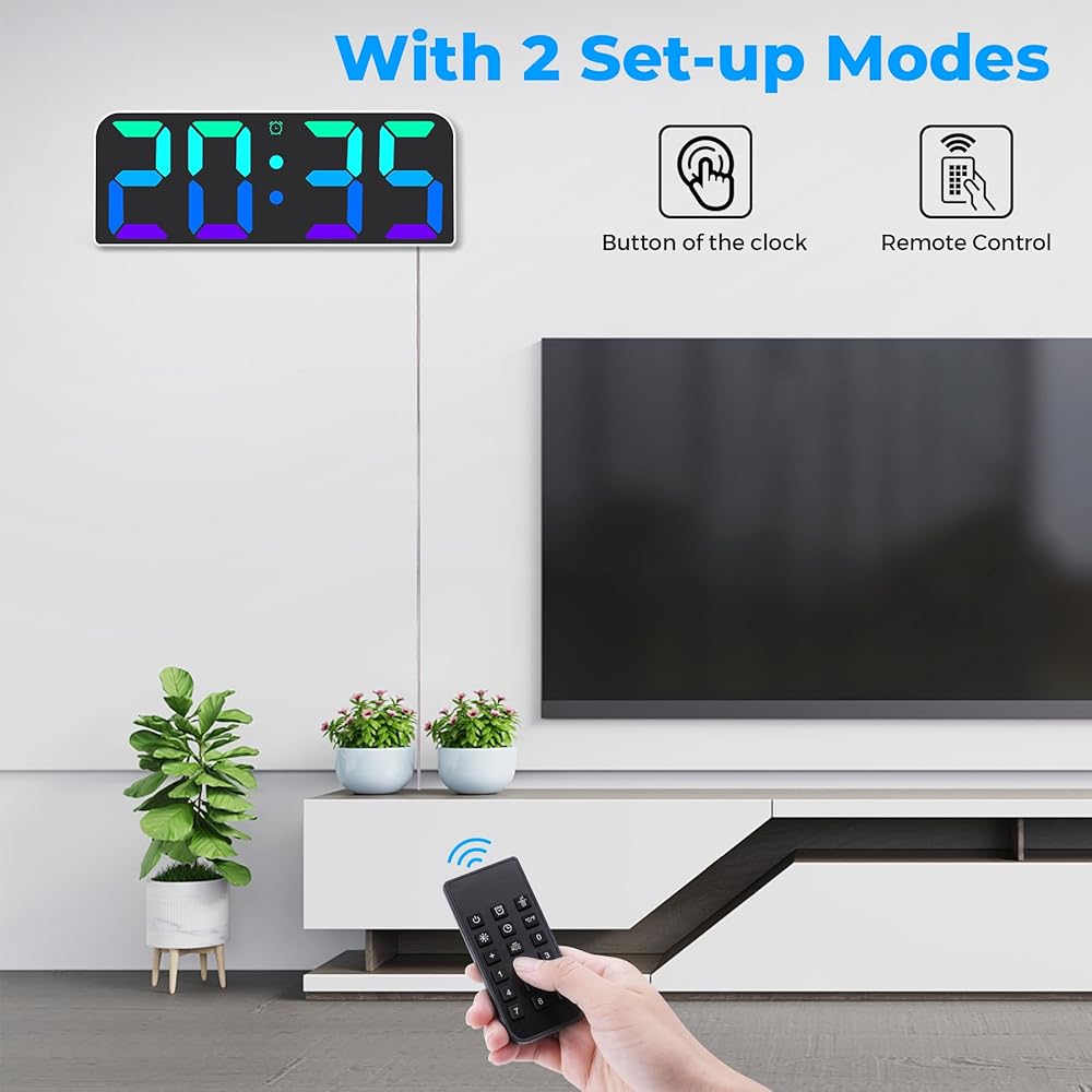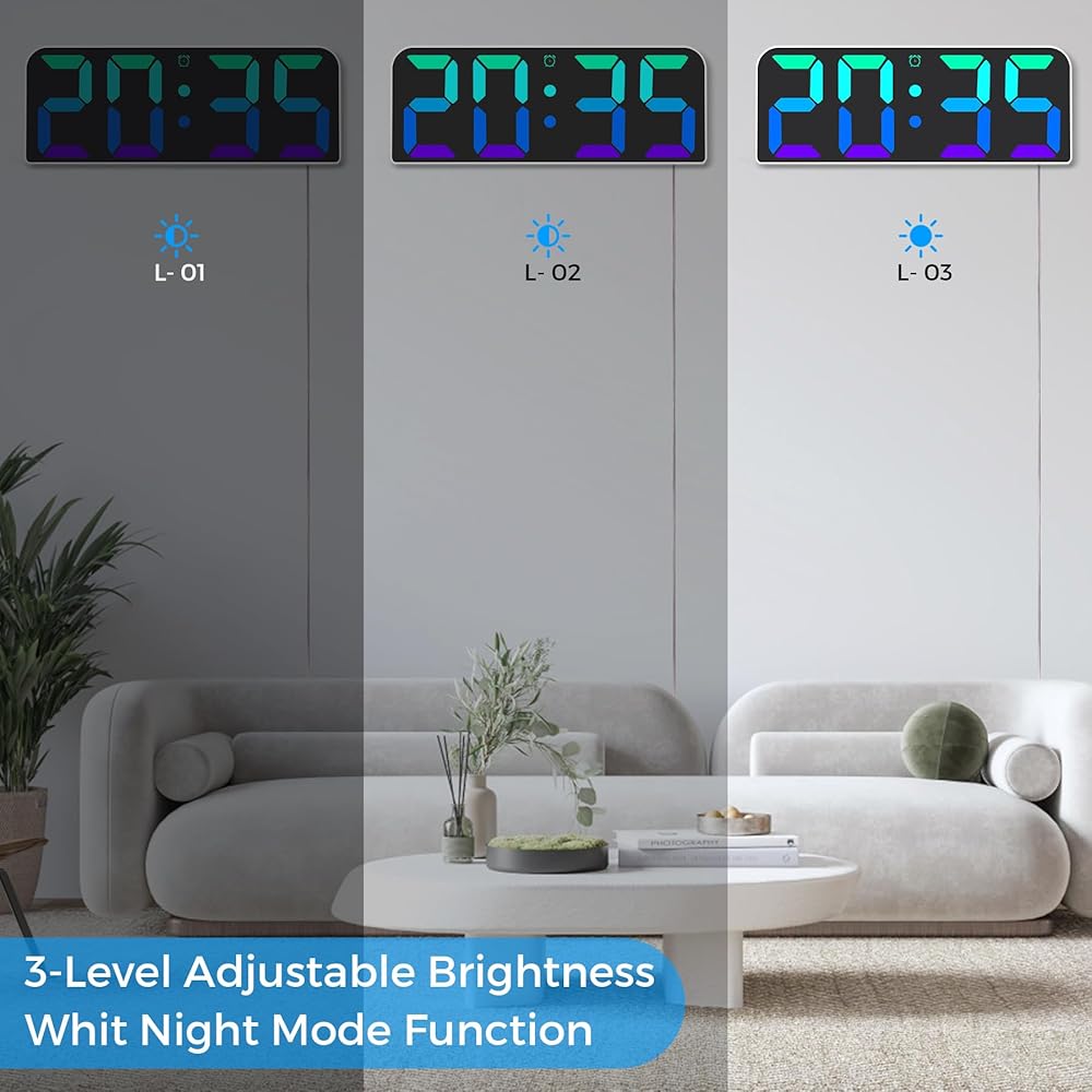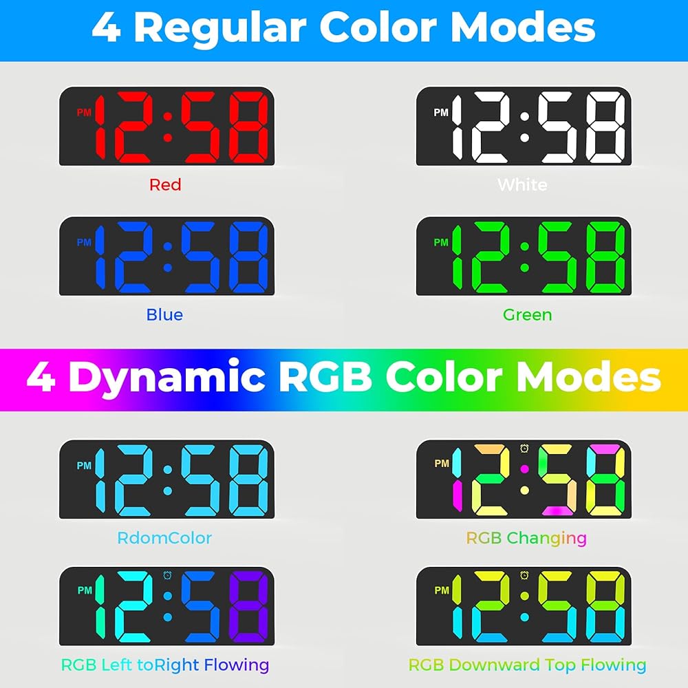 شاشة تغيير الألوان RGB - أحدث شاشة تغيير الألوان RGB تجعل عرض الوقت أكثر ألوانًا ووفرة. تتميز ساعة RGB بـ 8 أوضاع ألوان (4 أوضاع ديناميكية + 4 أوضاع ثابتة)، مما يوفر لك تجربة بصرية ممتازة مختلفة، ومناسبة لغرفة المعيشة وغرفة النوم وديكور المنزل.