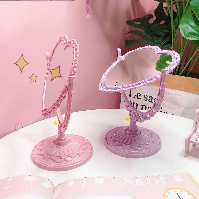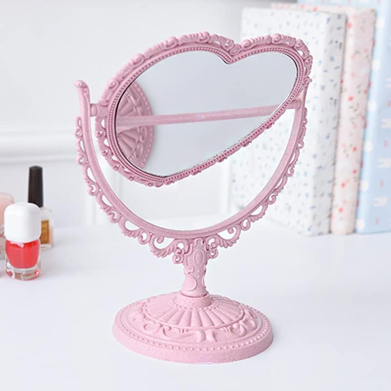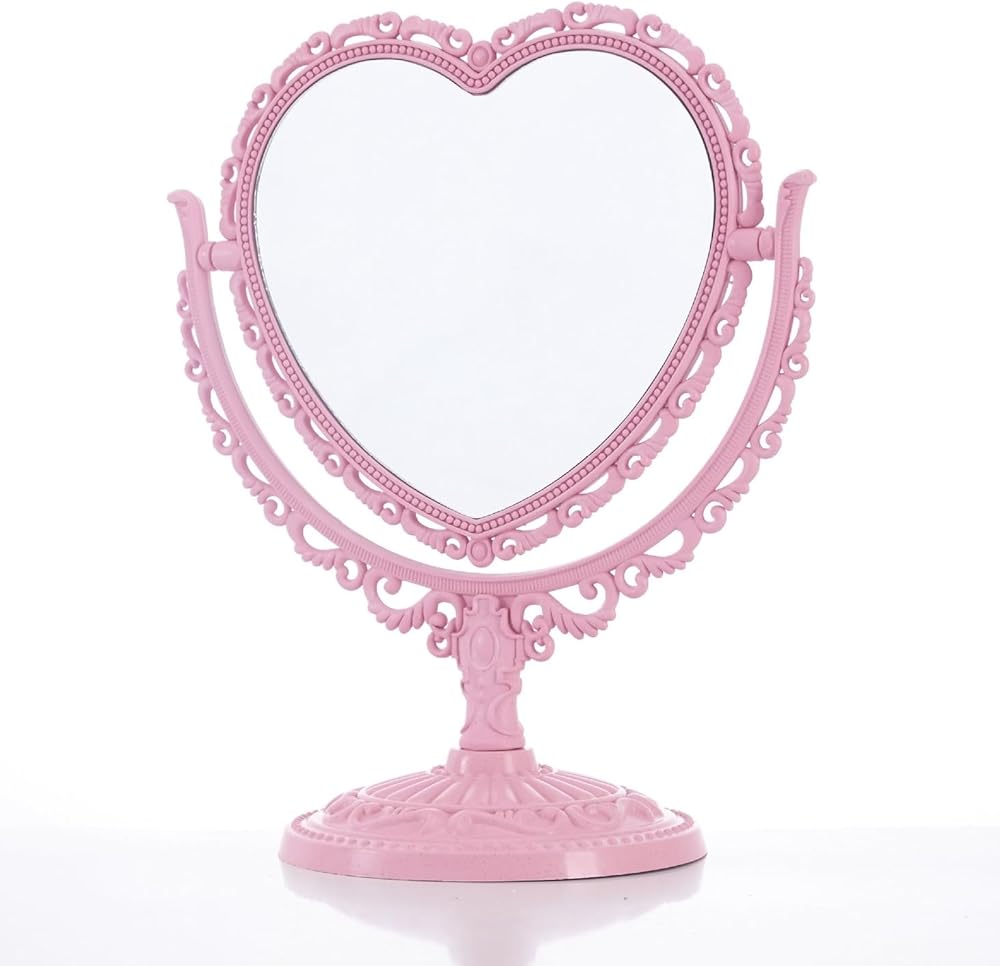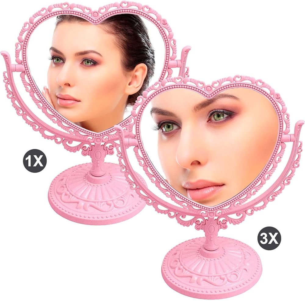 *Heart Shaped Mirror Double Sides room decor. *Tabletop Vanity Mirror DoubleSided Magnifying Makeup Mirror with 360 Degree Rotation.It is both a mirror and an ornament, which not only can illuminate your own beauty, but also decorate the house,very cute and attractive. *he size of this rotatable dresser mirror is 8 x 9.8 x 5 inches, Glass size is 6 x 5 inches.With nonslip bottom designed, more stably to stand which is suitable for your dressing table. *It comes with high definition 3X magnification on one side and regular on the other side.base is detachable, convenient for storage and carrying,It is suitable for office home or travel makeup shaving, dressing,etc. *The mirror is fragile. Please understand if it is damaged on the way. Remember to contact us in time to solve all your troubles. I believe this must be a happy shopping for you.