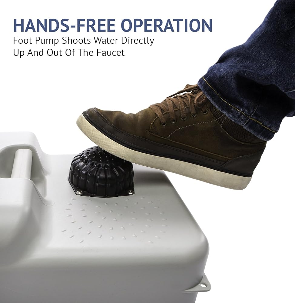 تشغيل مريح بدون استخدام اليدين - تقوم مضخة القدم المبتكرة بإطلاق المياه العذبة 180 مل يدويًا من خلال الصنبور من أجل نظافة أفضل والحفاظ على البيئة بشكل أفضل. يوفر خزان المياه العذبة سعة 19 لتر أكثر من 100 غسلة عند تعبئة واحدة.
