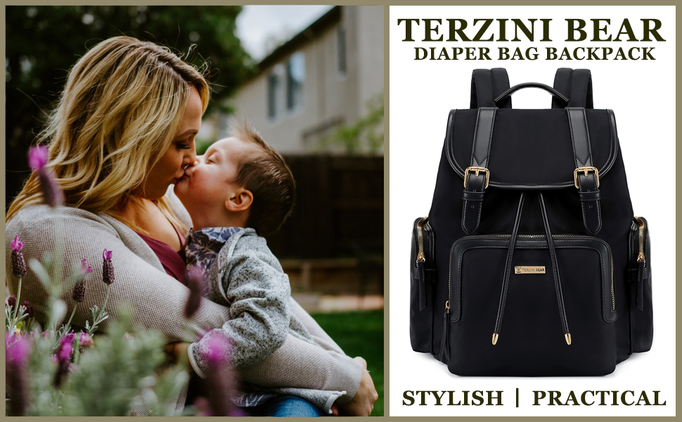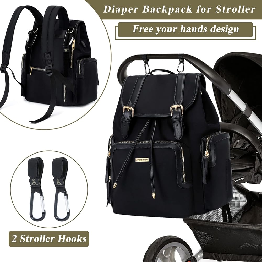 • 𝗪𝗛𝗔𝗧 𝗬𝗢𝗨'𝗟𝗟 𝗚𝗘𝗧:Terzini Bear black diaper bag backpack size:15"X10.5"X7.5",volume about 19L, it's not too large or too small.This cute diaper backpack has many organizer compartments,roomy enough to store most of baby things.It comes with a changing mat & 2pcs stroller hooks.