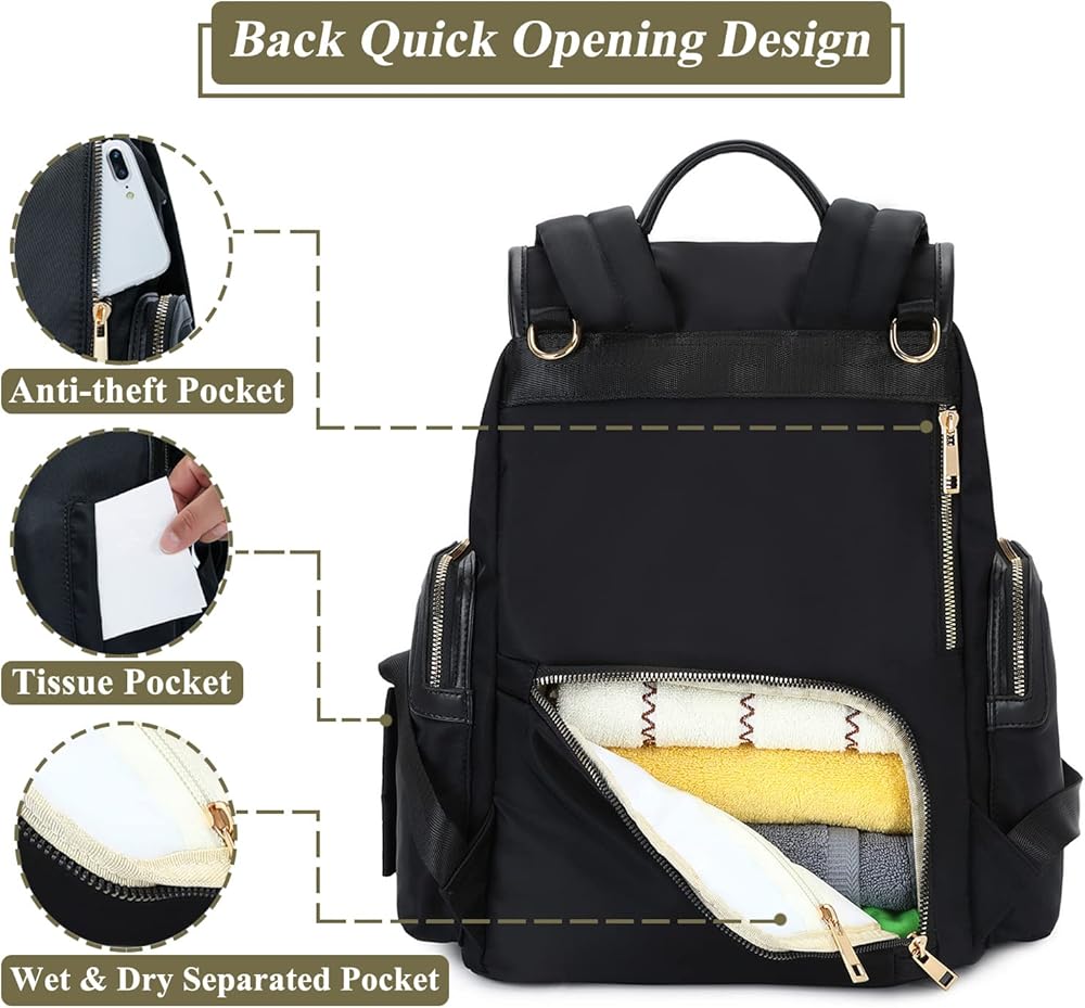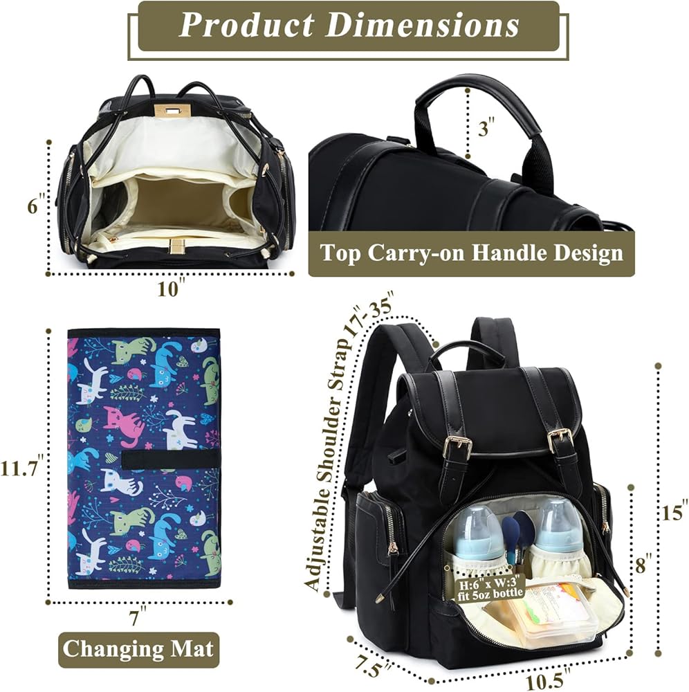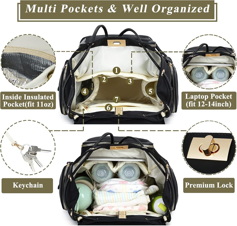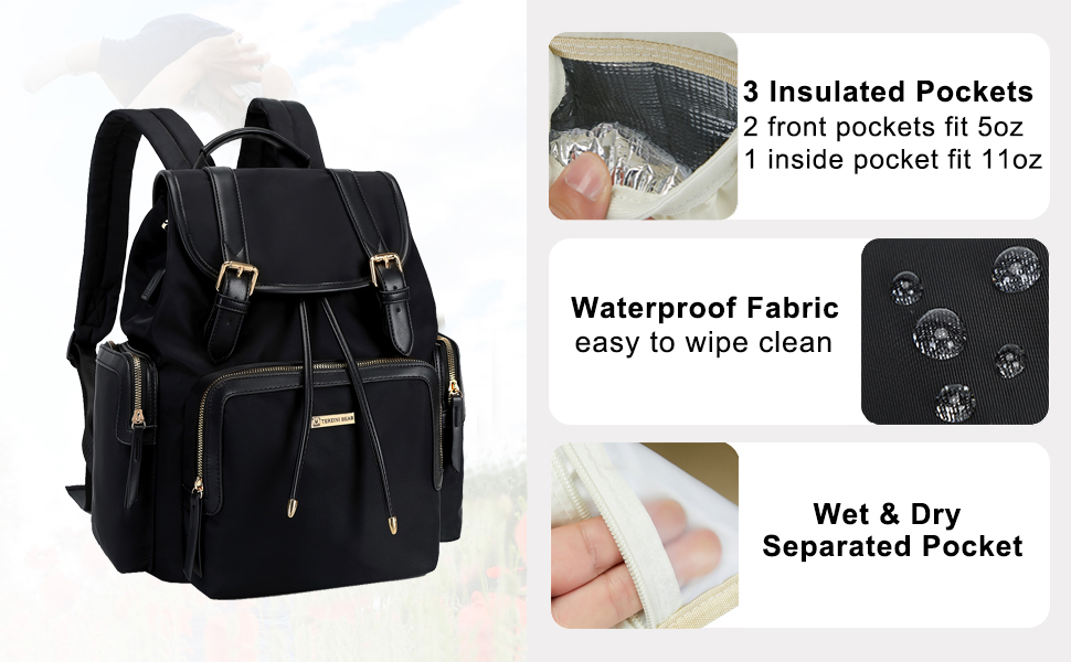 • 𝗠𝗨𝗟𝗧𝗜 𝗣𝗢𝗖𝗞𝗘𝗧𝗦 & 𝗪𝗘𝗟𝗟 𝗢𝗥𝗚𝗔𝗡𝗜𝗭𝗘𝗗:Diaper bag has 14 compartments,include 3 insulated bottle pockets(2 in front pocket fit 5oz bottle,1 large inside fit 5-11oz bottle),1 wipes side pocket.Other pockets can put baby essentials,this diaper backpack keeps all your things in an organizing way,it's a good baby bag for mom.