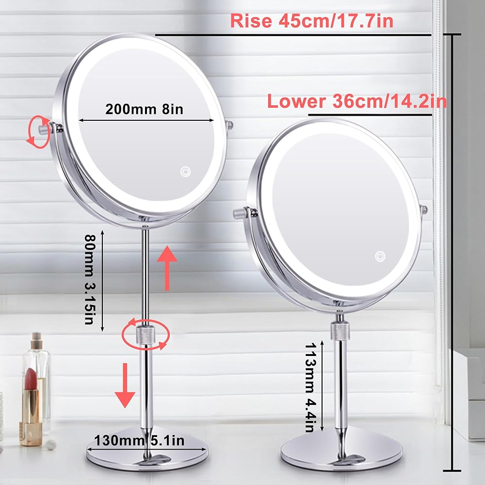 ✨مرآة مكياج مكبرة بإضاءة 10x: مرآة مكتب يصل قطرها إلى 8 بوصات ويبلغ ارتفاعها الإجمالي 13.5-16.5 بوصة. إنه مصنوع من الفولاذ عالي الجودة ويتميز بتصميم عصري مصنوع بدقة مع سطح معالج باستخدام عملية الطلاء الكهربائي متعددة الطبقات.