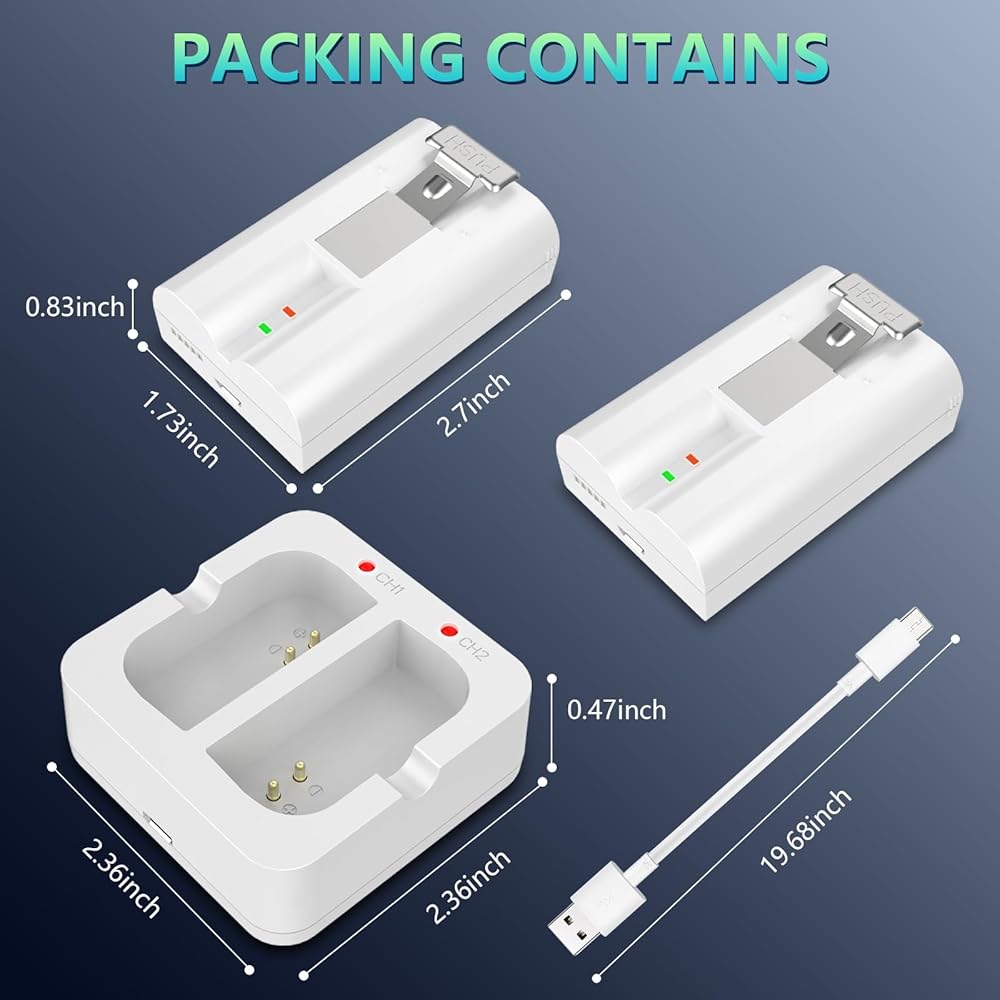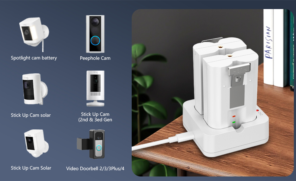 عبوتان من البطاريات البديلة مع محطة شاحن لكاميرا جرس الباب الدائري 2/3/4، وكاميرا الأضواء وكاميرا لاصقة، وبطاريات ليثيوم أيون قابلة لإعادة الشحن بقدرة 3.65 فولت/6040 مللي أمبير في الساعة للكاميرا الداخلية