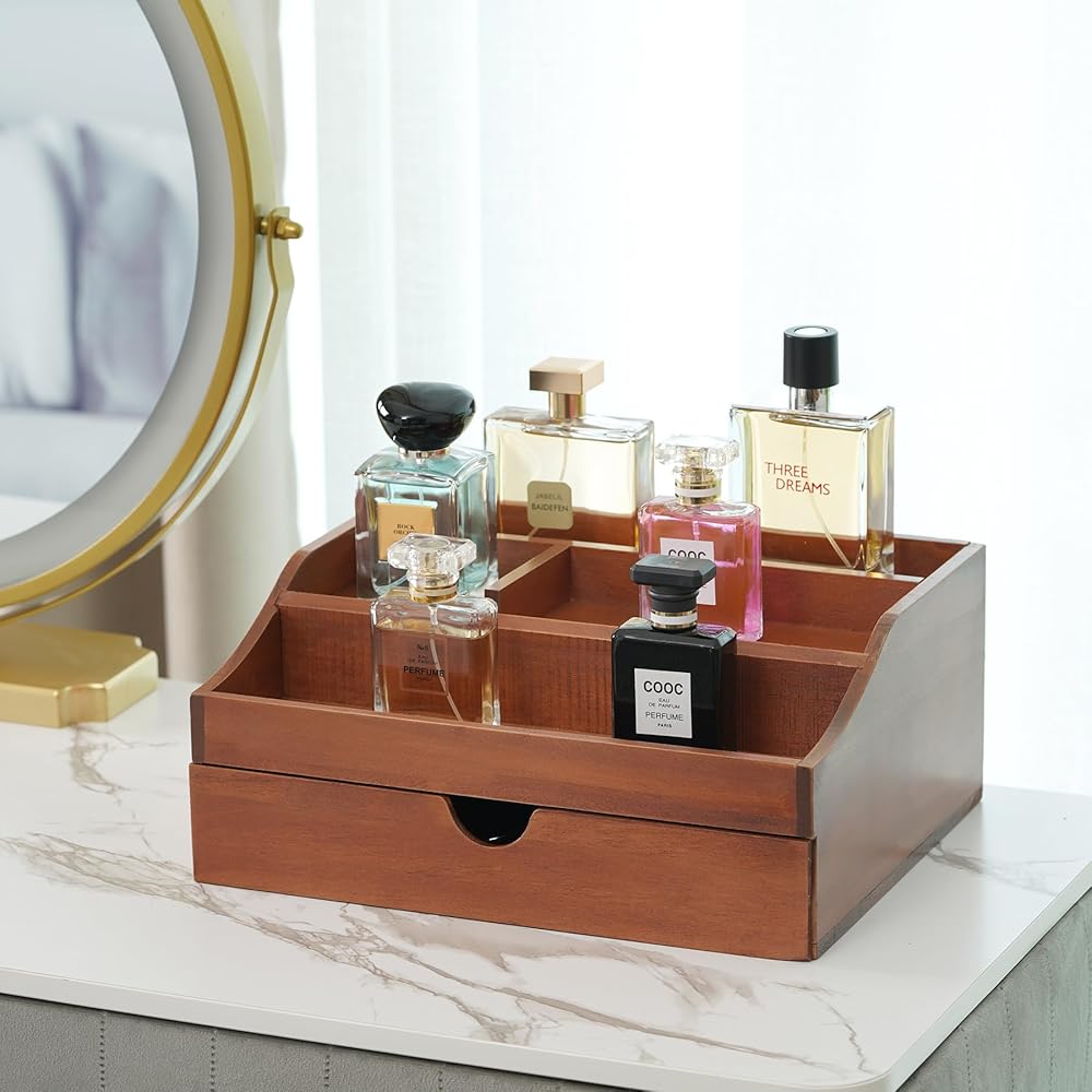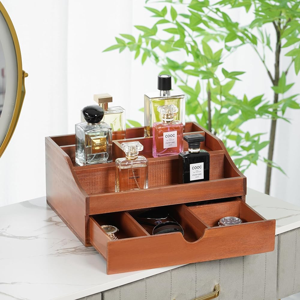 Large-Capacity Cologne Stand: The cologne holder comes with a practical drawer, divided into compartments to store small items such as watches, iPods, rings, necklaces, car keys, and more, keeping your dressing table tidy and organized.