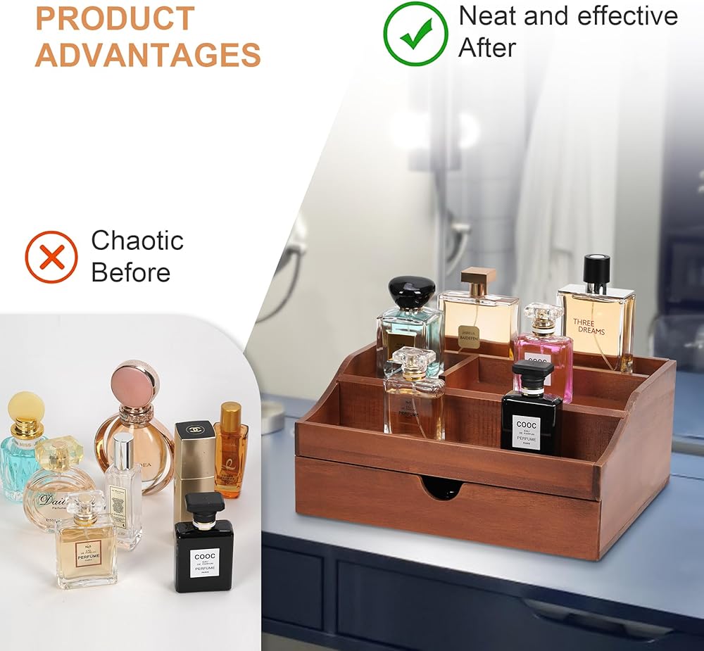 Durable Wooden Material:The cologne organizer is crafted from high-quality wood and exquisite workmanship, ensuring both durability and aesthetics. It serves as the perfect adornment for your dressing table.