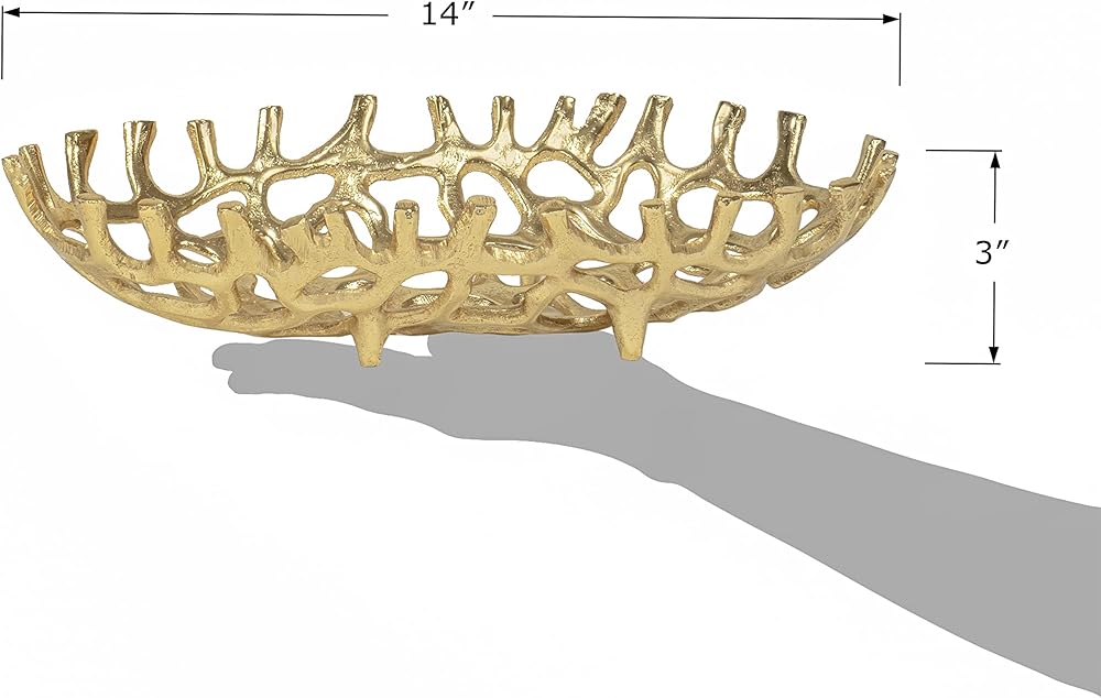 Crafted of aluminum with metallic gold finish, the tray is 14” L x 7.5” W x 3” H
