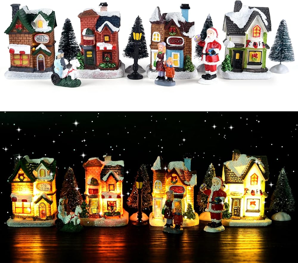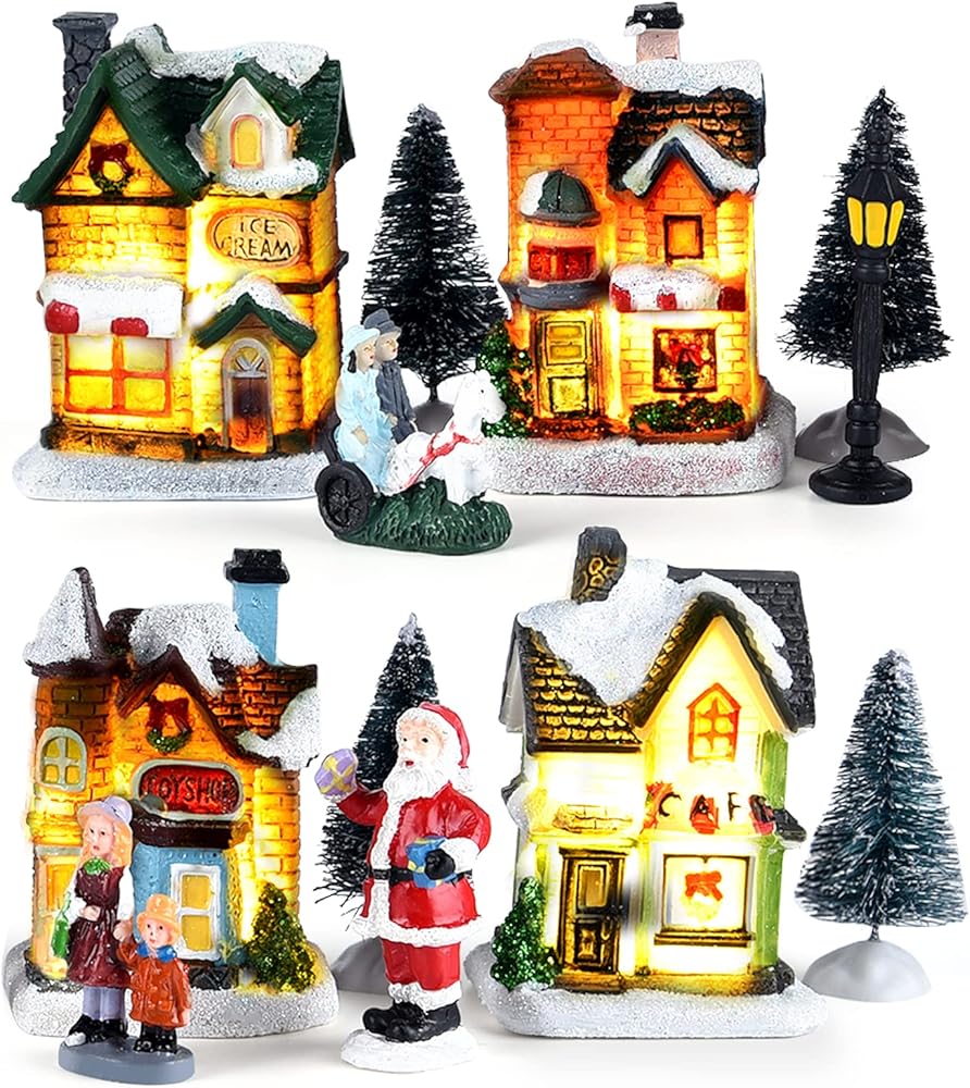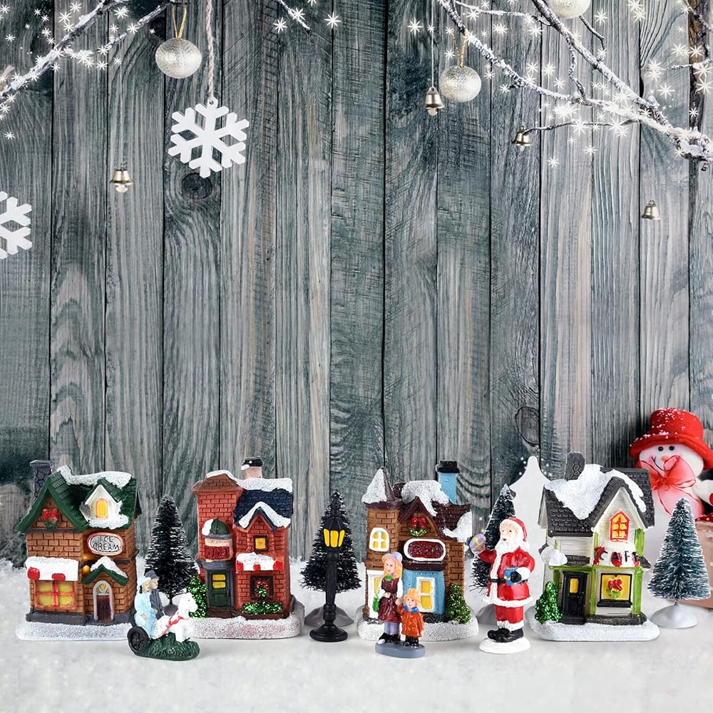 مجموعات قرية الكريسماس الرخيصة: 4 × منازل قرية الكريسماس، 4 × صنوبر كريسماس صغير، 4 × تماثيل الكريسماس مثل سانتا كلوز والأم والابنة وأزواج الكريسماس وما إلى ذلك. إكسسوارات قرية الكريسماس المصغرة