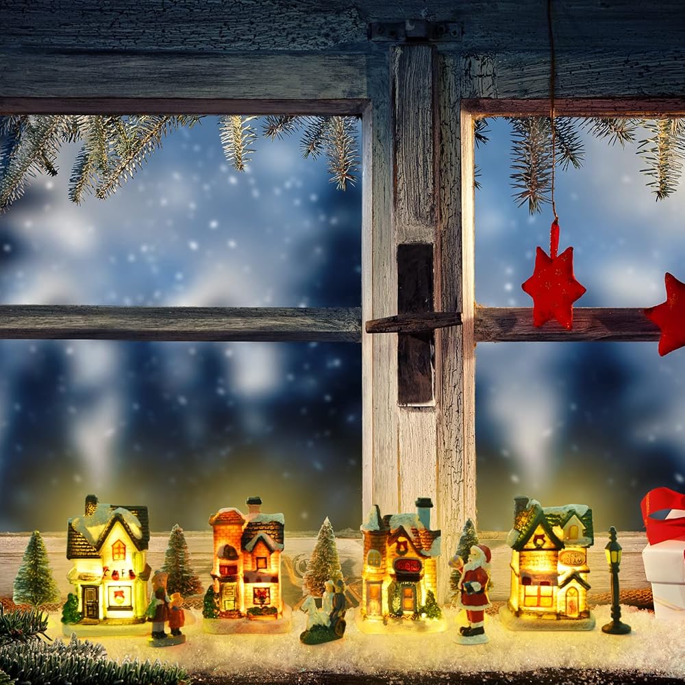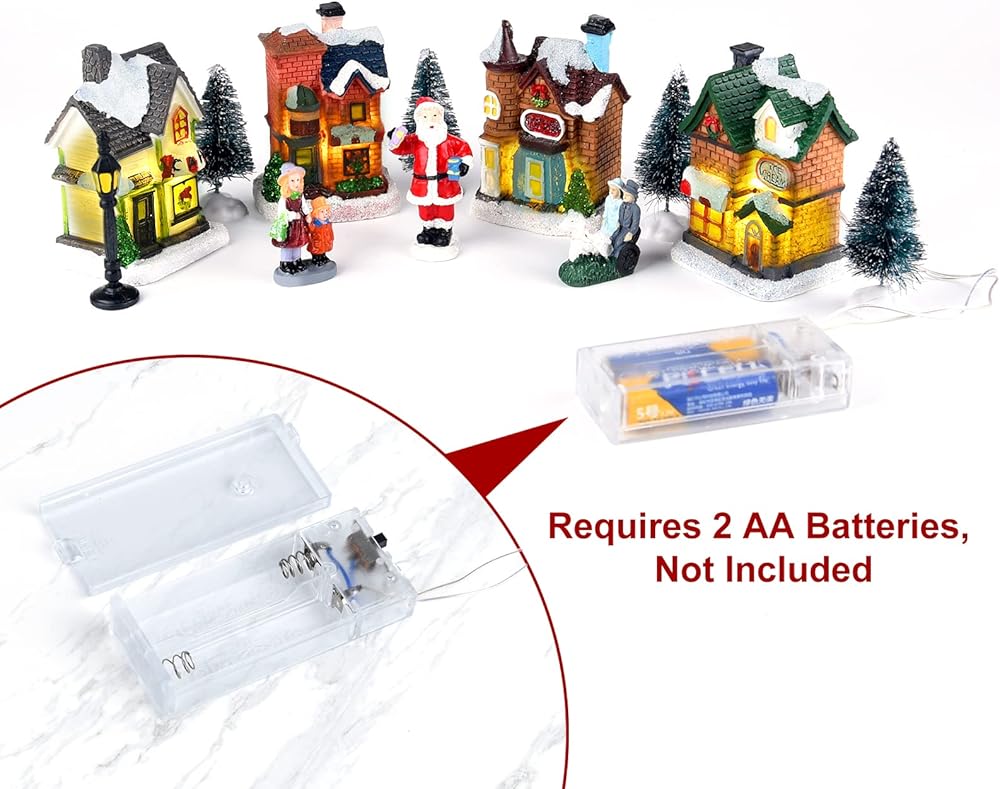 جودة ممتازة: منازل قرية الكريسماس وتماثيل الكريسماس الخاصة بنا مصنوعة من راتنج ABS، وأشجار الصنوبر الصغيرة مصنوعة من البلاستيك المتين وخفيف الوزن