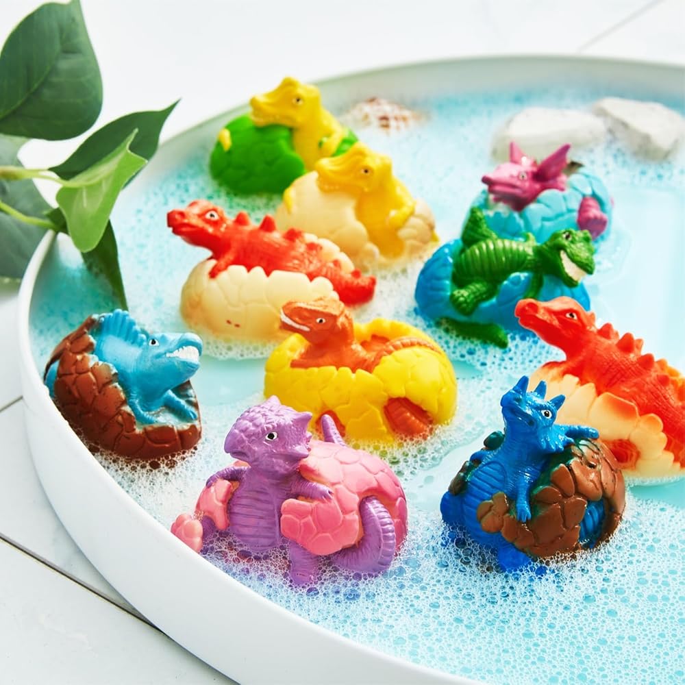 What You Get: 10 pieces of different styles of dinosaur egg bath toy. Colorful and beautiful patterns will bring endless hours of fun. With our bath toy set, you get a variety of floating toys that will make bath time even more exciting. Your child will be delighted to have their own collection of bath toys to play with.