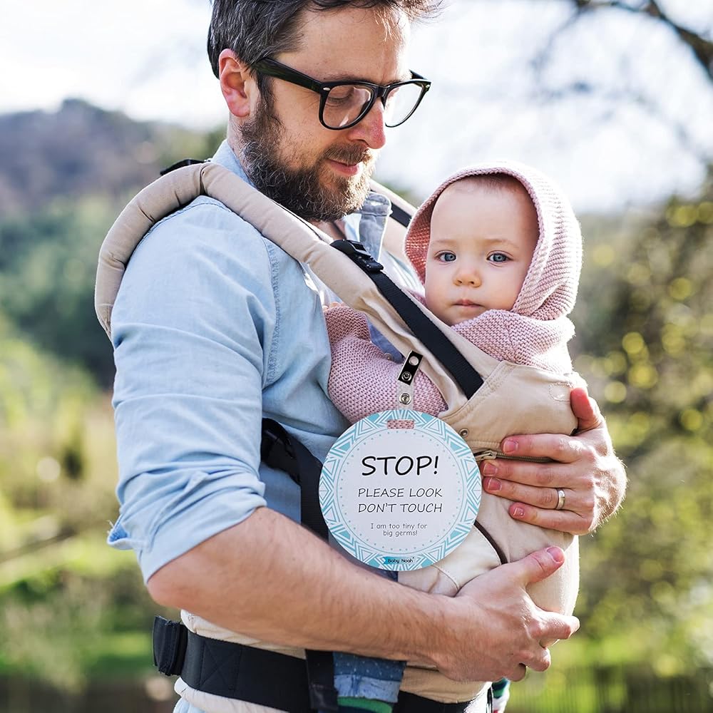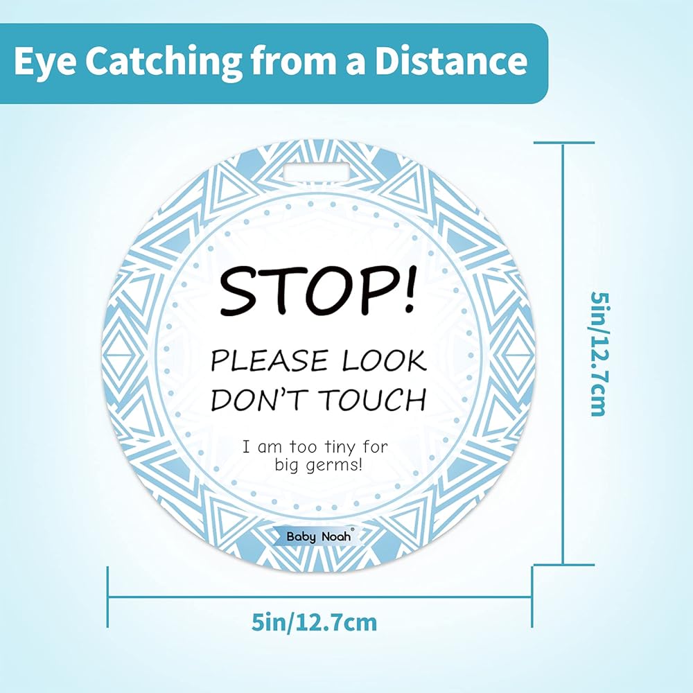 ✿ علقها في أي مكان - تأتي مع علامتين لتجنب لمس تحذير الطفل مطبوع على كلا الجانبين. تأتي مع شريط لاصق حتى تتمكن من وضعه على مقعد السيارة وعربة الأطفال، ومشبك لك لتثبيته على حقيبة الظهر أو حامل الأطفال أو مظلة عربة الأطفال أو أي مكان تريده.