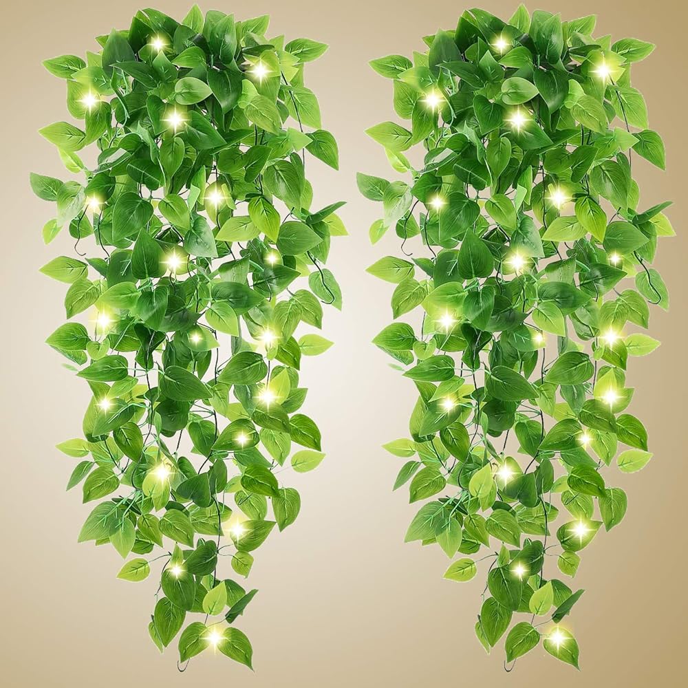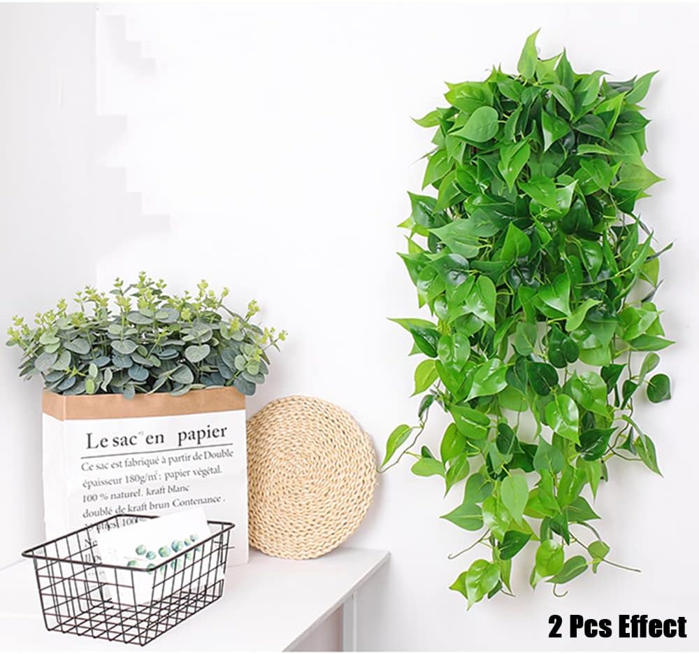 نباتات معلقة صناعية من WEISPARK - قطعتان من أوراق كرمة اللبلاب المزيفة ونباتات المطبخ للحائط وغرفة المنزل والحديقة وإكليل الزفاف والديكور الداخلي والخارجي (بدون سلال)