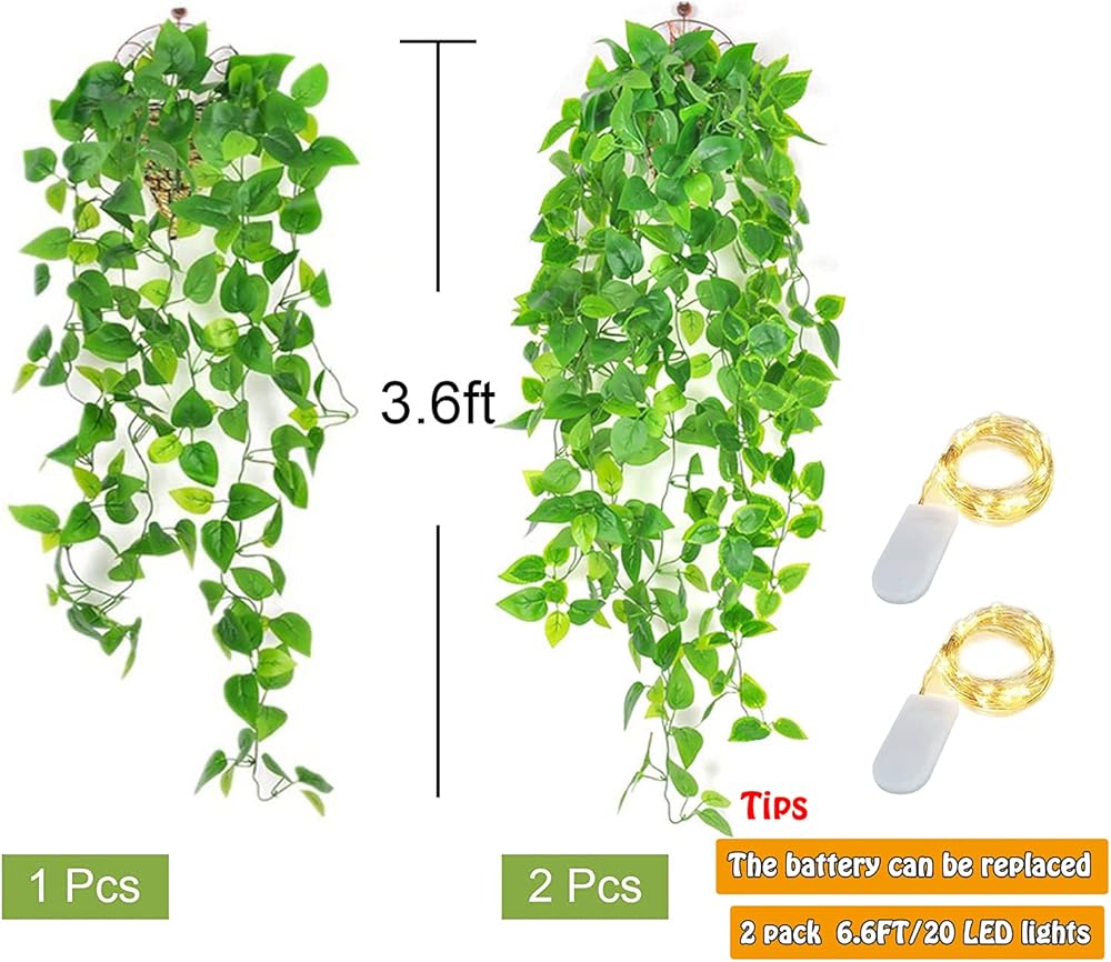 • ✭ تتضمن العبوة: عبوتين من نباتات التعليق الاصطناعية الخضراء، كل منها بها 5 شُعب، إجمالي طول نبات التعليق المزيف 110 سم/43.3 بوصة/3.6 قدم، وعرض نبات الكرمة حوالي 25 سم/9.8 بوصة. حوالي 160 ورقة خضراء مزيفة في كل عبوة، إجمالي 320 ورقة. قطعتان من المصابيح الجنية 20 LED (عمر البطارية 48 ساعة، يمكن استبدال البطارية بسهولة)، ويمكنها أيضًا تزيين الأشياء الأخرى التي تريدها.