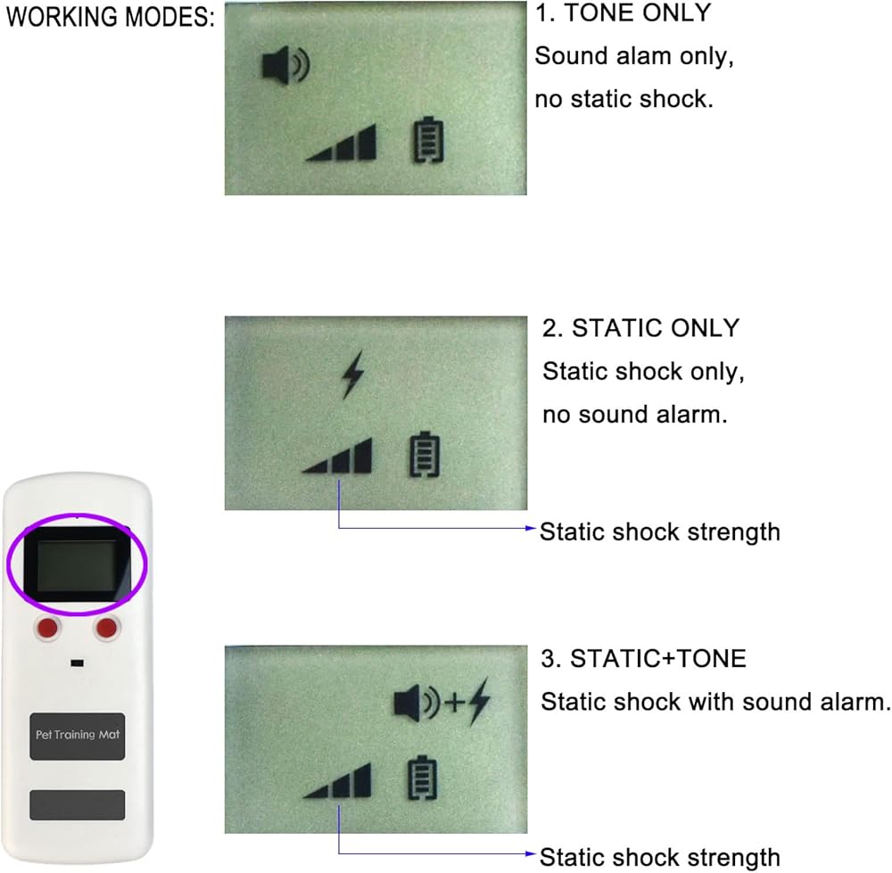 النغمة: منبه صوتي + صدمة كهربائية منخفضة جدًا، إنه آمن جدًا بحيث يمكنك التحقق من السجادة بيدك.
