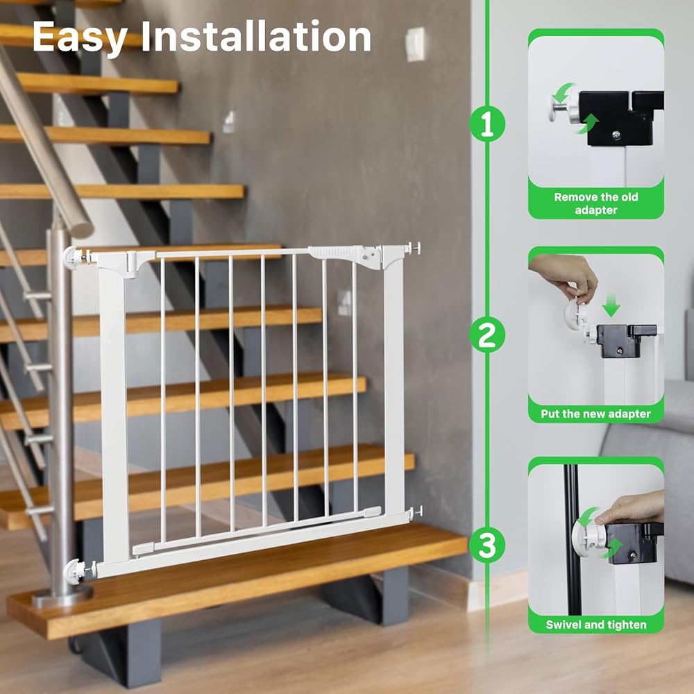 【سهلة التركيب】 تركيب محول درابزين تمديد بوابة الطفل الخاص بنا سريع وسهل. لا توجد حاجة لأي أدوات، ولا تحتاج إلى حفر أي ثقوب في الجدران أو السلالم أو الدرابزين. ببساطة ضع محول التثبيت بالضغط لبوابة الطفل عند نقطة التثبيت المقابلة، ثم قم بتشغيل الصمولة وشدها.