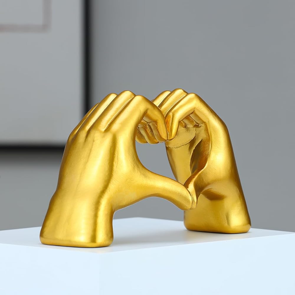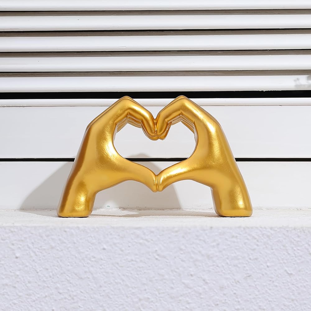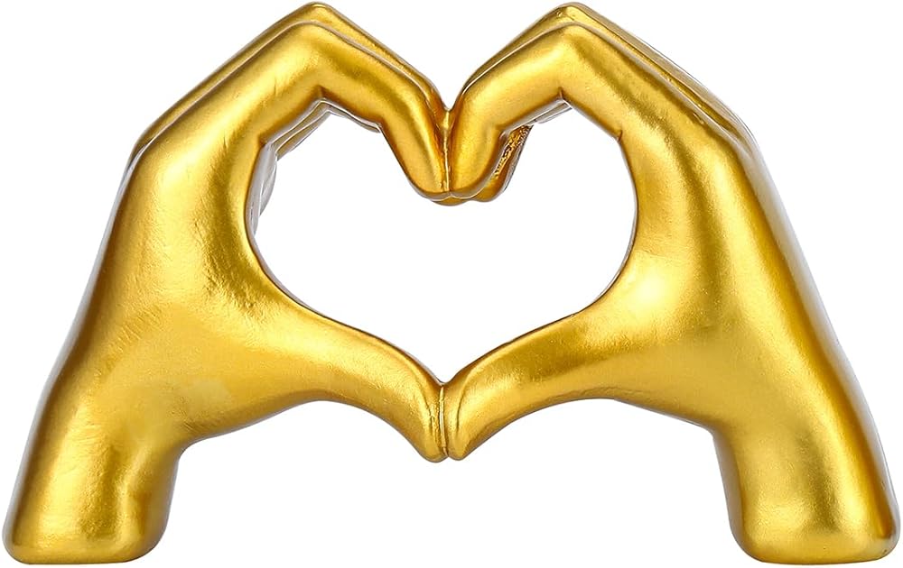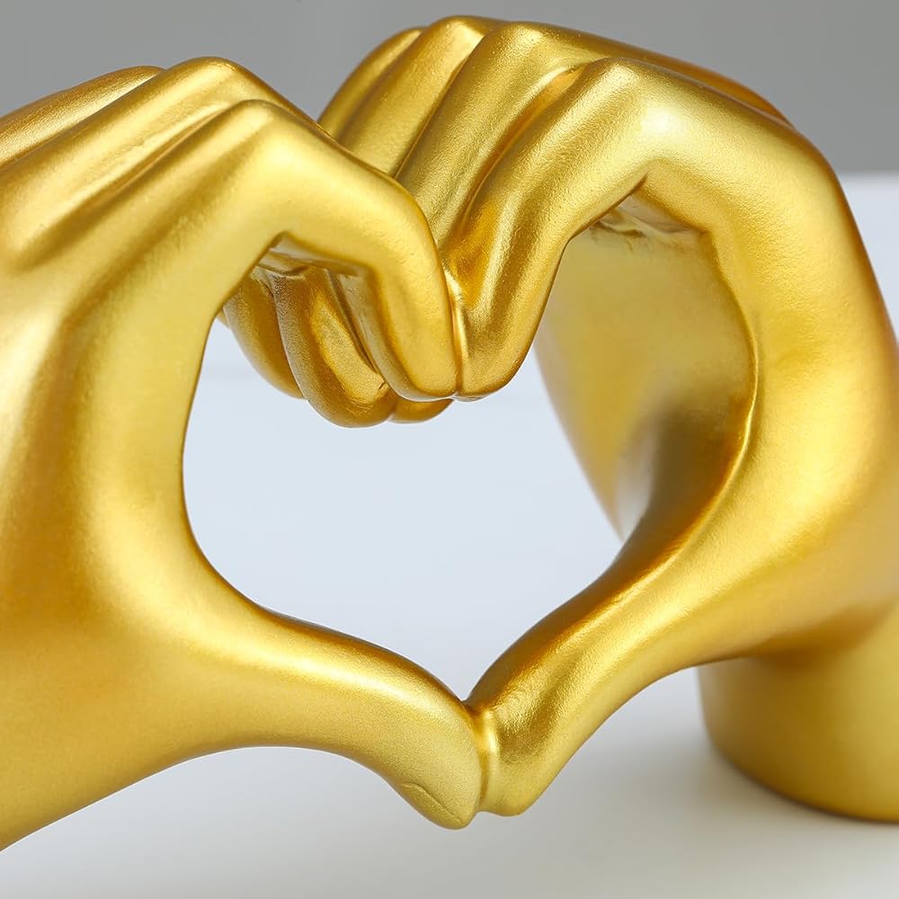 Introducing the Gold Heart Hands Sculpture, a unique and exquisite piece of art that will transform the look of your home decor. Crafted from high-quality materials, this beautiful sculpture features a heart shape hand design, adorned with gold accents and intricate details. It's a perfect addition to your living room, bedroom, office, or any other space that needs a touch of elegance and personality.