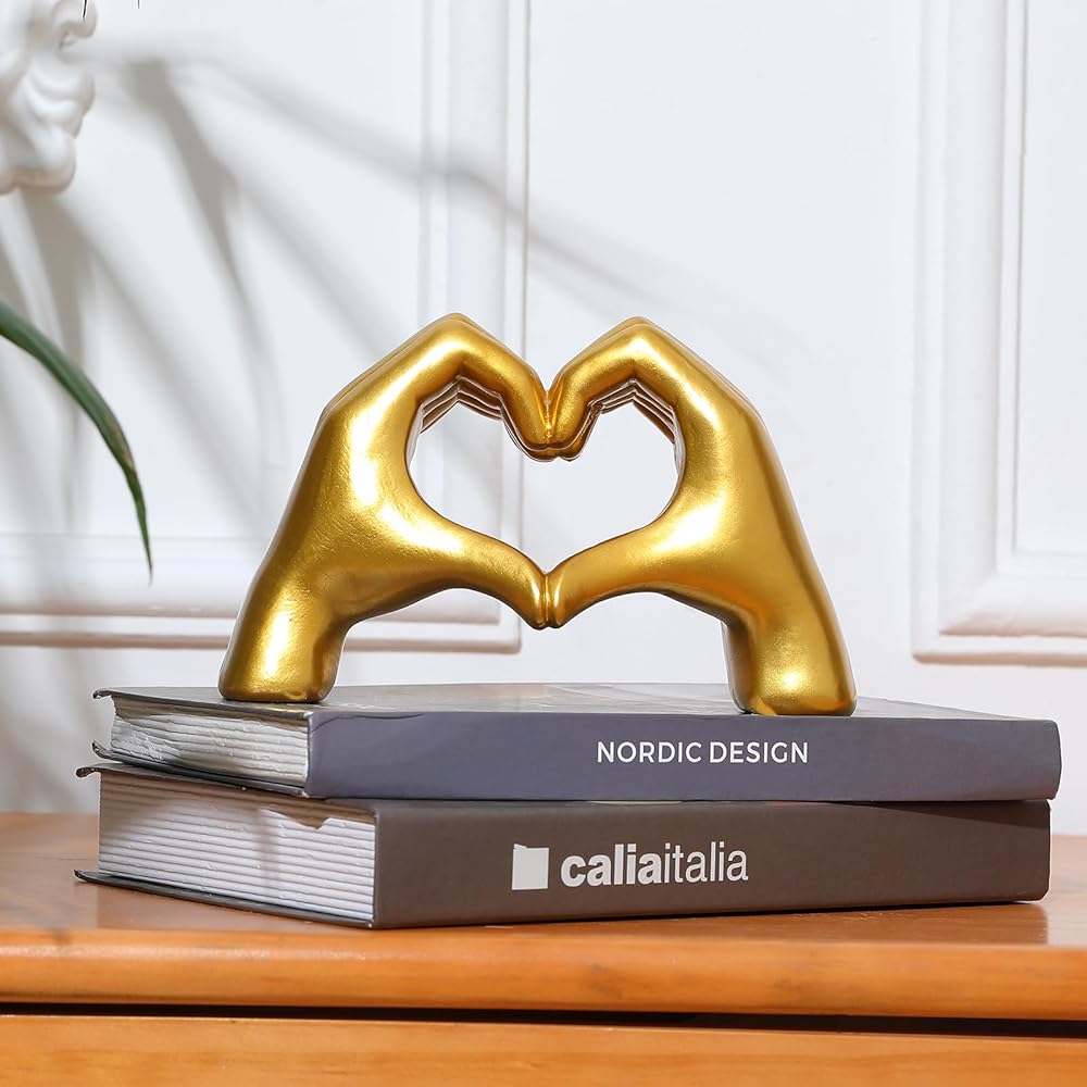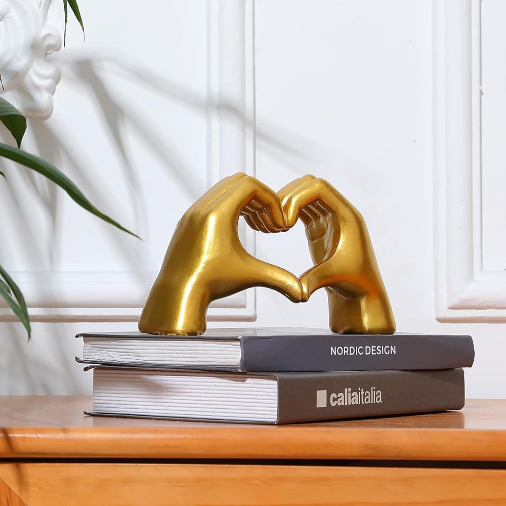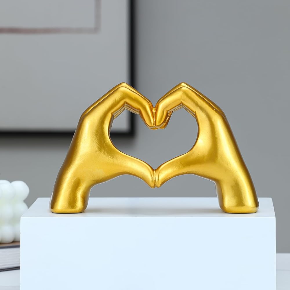 Introducing the Gold Heart Hands Sculpture, a unique and exquisite piece of art that will transform the look of your home decor. Crafted from high-quality materials, this beautiful sculpture features a heart shape hand design, adorned with gold accents and intricate details. It's a perfect addition to your living room, bedroom, office, or any other space that needs a touch of elegance and personality.