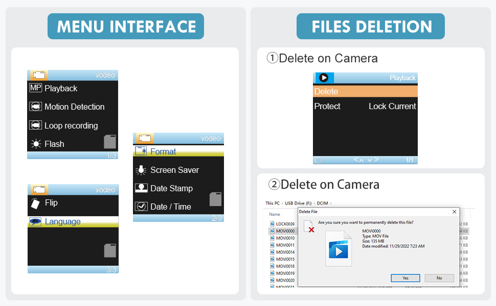 【شاشة ملونة مقاس 1.3 بوصة】: مع شاشة عرض مقاس 1.3 بوصة، توفر لك تجربة مشاهدة مريحة. يمكنك تشغيل الفيديو وحذف مقاطع الفيديو غير الضرورية على الكاميرا مباشرة.