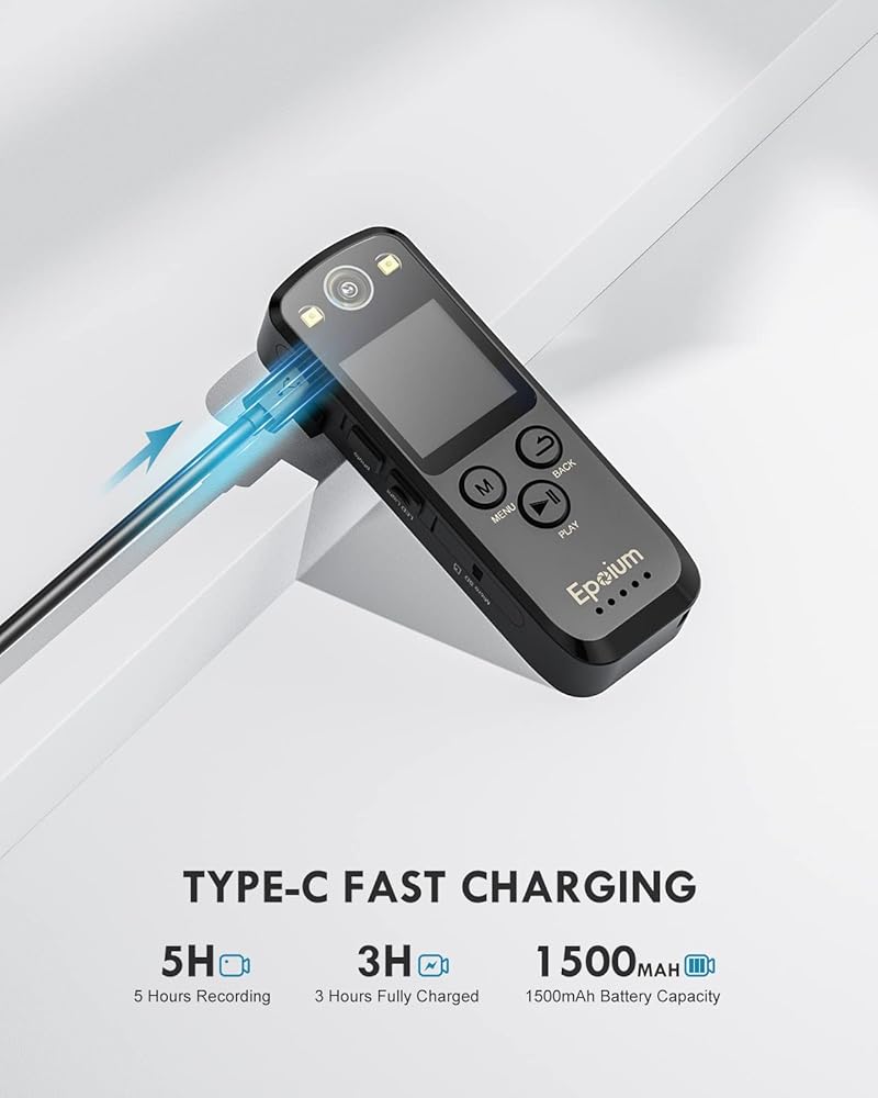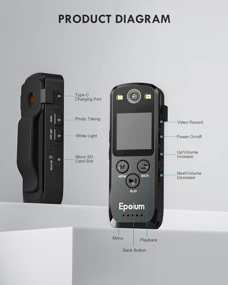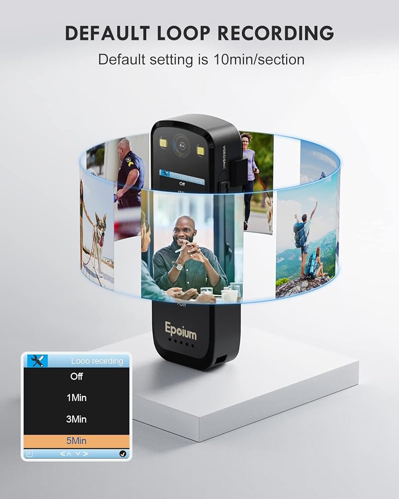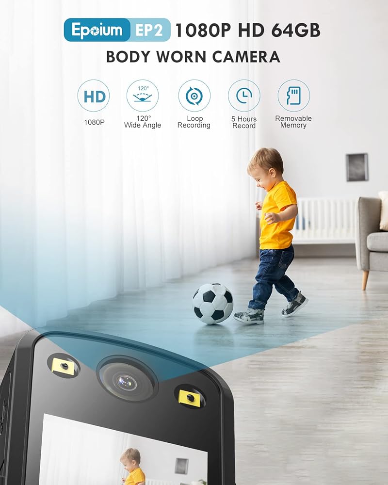 【HD 1080P، عدسة واسعة الزاوية 120 درجة】: تعريف كاميرا EP2 القابلة للارتداء هو HD1080P. مع زاوية واسعة 120 درجة، يمكنه تسجيل مقاطع فيديو واضحة والتقاط صور فورية. لن تفوت أي لحظات أو أدلة مهمة.