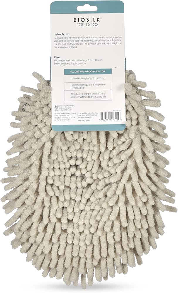 بيوسيلك يتميز قفاز العناية بالكلاب 2 في 1 من فور دوجز بمنتجين رائعين للعناية بالحيوانات الأليفة في عبوة واحدة مريحة. يتميز أحد الجانبين بفرشاة سيليكون مرنة على شكل مخلب للعناية بالحيوانات الأليفة. فرشاة تصفيف الشعر المرنة هذه رائعة للاستخدام كفرشاة يومية لطيفة على كلبك لإزالة الشعر المتساقط. يمكن استخدام قفاز العناية بالكلاب العملي هذا أيضًا كقفاز تدليك لمنح حيواناتك الأليفة فركًا واحتضانًا مريحًا. يمكن استخدام فرشاة السيليكون أيضًا على الحيوانات الأليفة الرطبة أثناء الاستحمام لرغوة وفرك فروها وبشرتها مع الحفاظ على يديك جافة ونظيفة. اقلب قفاز الحلاقة إلى الجانب الشامي الماص لاستخدامه على الحيوانات الأليفة الرطبة للمساعدة في تجفيفها بعد الاستحمام أو الوقوع في المطر. تمتص ألياف الشانيل الدقيقة الناعمة الماصة الماء بسرعة وسهولة مع الحفاظ على نظافة يديك. التعليمات: ضع يدك داخل القفاز مع الجانب الذي تريد استخدامه في راحة يدك. قم بتمرير فراء حيوانك الأليف في اتجاه نمو الشعر. ابدأ من الخلف وشق طريقك إلى الأمام. يمكن استخدام هذا القفاز لإزالة الشعر المتساقط أو التدليك أو التجفيف. العناية: يُغسل في الغسالة بماء بارد باستخدام منظف خفيف. لا تستخدم المبيضات. لا تجففه في المجفف. يوضع بشكل مسطح ليجف بالهواء. تأكد من الاطلاع على مجموعتنا الكاملة من منتجات العناية بالكلاب من بيوسيلك for Dogs. كانت بيوسيلك عنصرًا أساسيًا في مجال العناية بالشعر البشري برائحتها المميزة منذ الثمانينيات وكانت أول خط لمنتجات العناية بالشعر تحتوي على الحرير. يتم استخدام نفس بروتينات الحرير الخاصة في حلول العناية بالحيوانات الأليفة بيوسيلك For Dogs التي تحمي من الحرارة وتقوي وترطيب الفرو للحصول على لمعان لا مثيل له. رضاكم هو أولويتنا: يرجى التواصل مع أي أسئلة حول هذا المنتج في فيتش فور بتس.