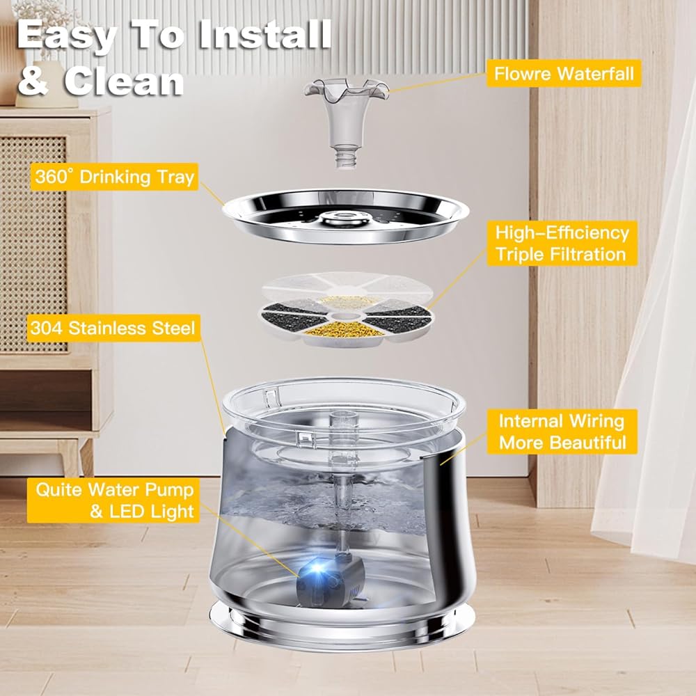 【مادة من الفولاذ المقاوم للصدأ 304】نافورة مياه أوتوماتيكية للقطط مصنوعة من الفولاذ المقاوم للصدأ 304، أكثر متانة، آمنة للاستخدام في غسالة الأطباق وسهلة التنظيف (تأتي مع قطعة قماش للتنظيف). يتميز بسطوع 4K ومظهر أكثر روعة.