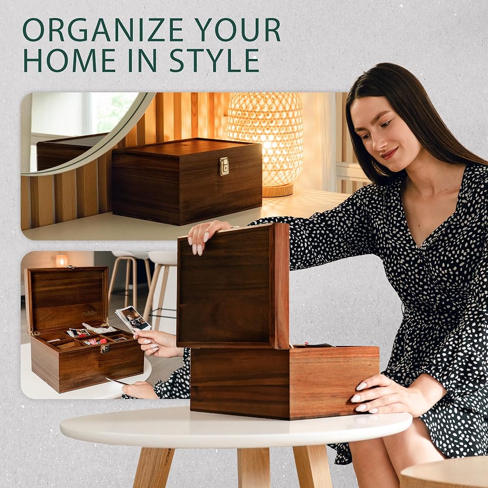 ✔️ حجم كبير للحفاظ على جميع لحظاتك الثمينة: قياس 30.48 × 20.32 × 15.24 سم، تم تصميم هذا الصندوق الخشبي لحماية ذكرياتك الثمينة. مثالية للمجوهرات والصور وتذكارات الزفاف والأطفال والساعات والحروف والقرطاسية والفنون والحرف اليدوية