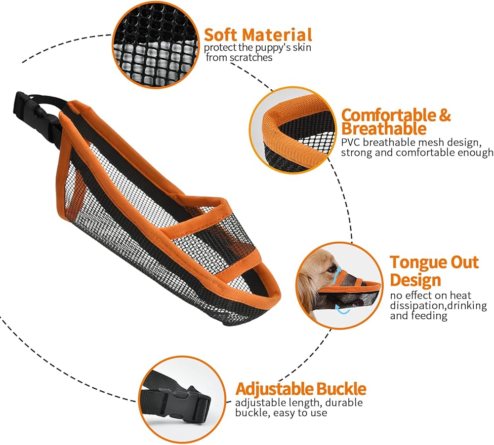 قابلة للكسر - كمامة الجرو مصنوعة من مواد صديقة للبيئة، وحافة النايلون ناعمة ومقاومة للاهتراء، ومسامية ومريحة، ولا تؤذي الجلد. أخف وزنًا من كمامات السيليكون والسلة، كمامة الكلاب الشبكية هذه أكثر راحة وخالية من الأعباء وأسهل في قبولها للكلاب. يمكن للكلاب أن تتنفس دون أي مشكلة حتى في فصل الصيف الحار.