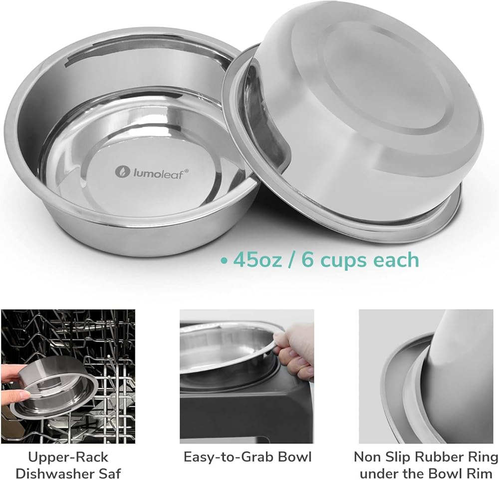 💖متين وثابت - حامل وعاء الكلب مصنوع من مواد متينة ويأتي مع أوعية من الفولاذ المقاوم للصدأ قابلة للفصل وآمنة للاستخدام في غسالة الأطباق بسعة 1350 مل (45 أونصة). توفر الحلقة المطاطية البيضاء غير القابلة للانزلاق الموجودة على حافة الوعاء وكتلة الوزن الإضافية على الحامل المزيد من الثبات.