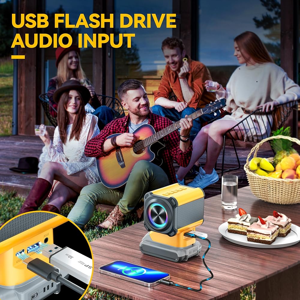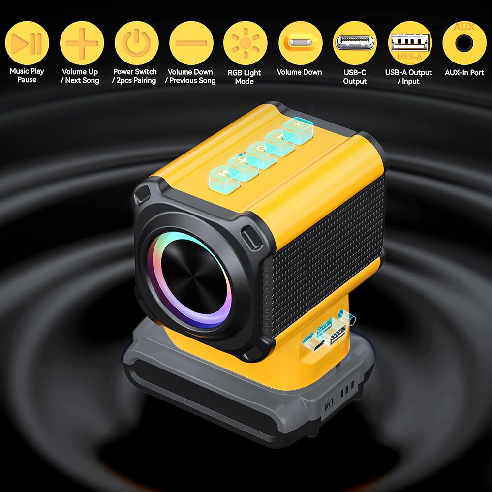 🎶مدخل/مخرج USB-A وUSB-C - مزود بمخرجات USB-A وUSB-C، اشحن هاتفك في موقع العمل أو المرآب أو الهواء الطلق أو التخييم. وفي الوقت نفسه، قم بتوصيل أجهزتك بسلاسة باستخدام مدخلات الصوت USB-A وAUX، مما يجعلها سماعة بلوتوث لاسلكية متعددة الاستخدامات للاستخدام المنزلي والخارجي.