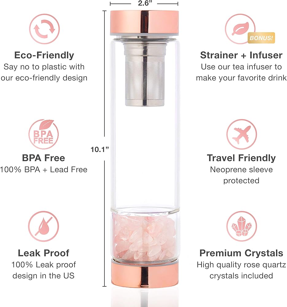 • 💜 المشاعر السيئة لم تتاح لها فرصة أبدًا: اشحن مشروبك المفضل بقوة مذهلة لبلورات الشفاء وأخبر مصاصي الطاقة والسحر السيئ أن يضيعوا. اختر من بين الكوارتز الوردي لتغذية شاكرا قلبك أو تسخير الطاقة الداخلية لديك مع كريستال الجمشت المهدئ لتتألق كل يوم بموقف "لا يمكن التغلب على هذا"! بالإضافة إلى ذلك، مع لمسة نهائية ذهبية وردية مذهلة، لا يمكن لزجاجة مصفاة الشاي الكريستالية هذه إلا أن تلفت الأنظار!