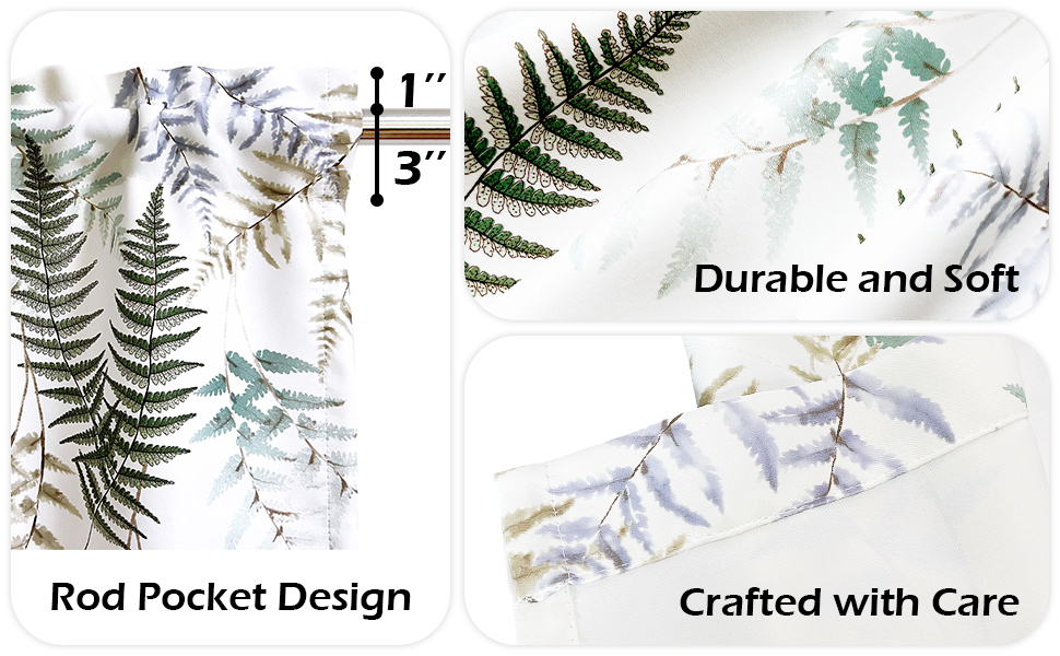 العبوة والأبعاد: تحتوي كل عبوة على طبقتين من الستائر بقياس 66 سم عرضًا و45 سم طولاً لكل لوحة. رأس 1 بوصة وجيب قضيب 3 بوصة يناسب معظم قضبان الستارة القياسية أو المزخرفة.