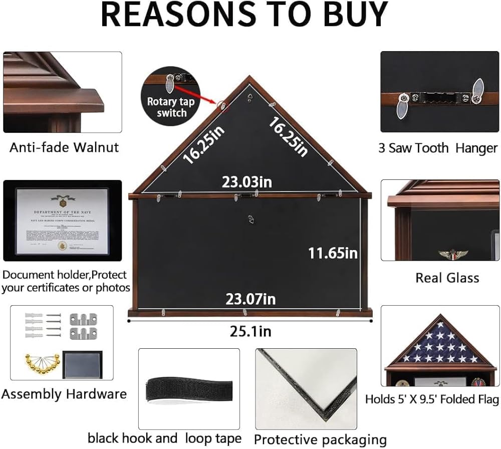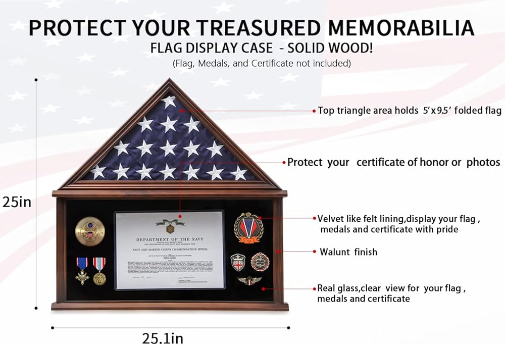 Anti-fade walnut finish flag display case, glass with transparency, document holder, velvet like felt lining, mounting hardware, to protect your treasured memorabilia