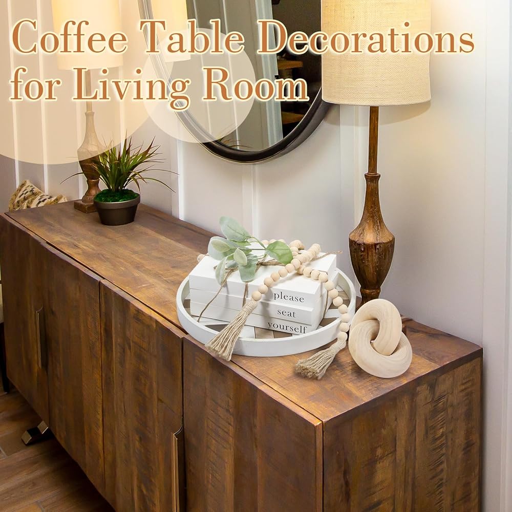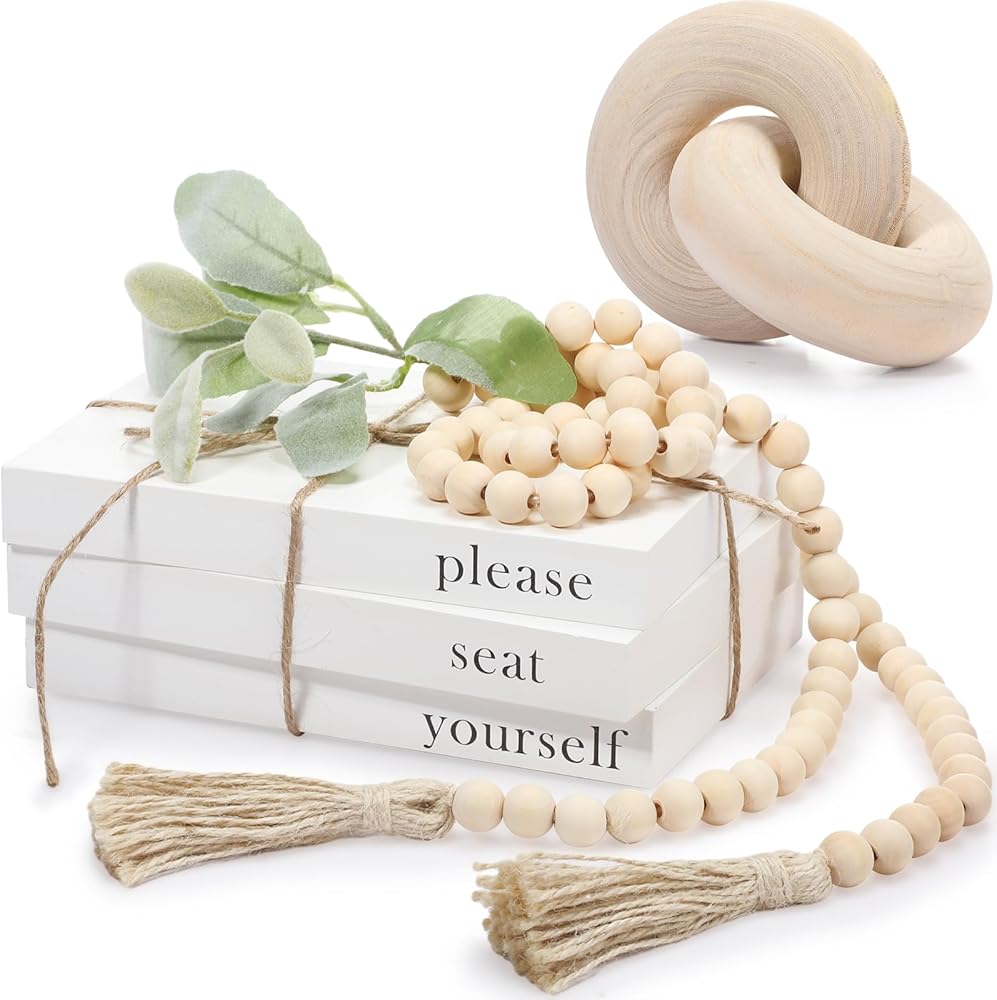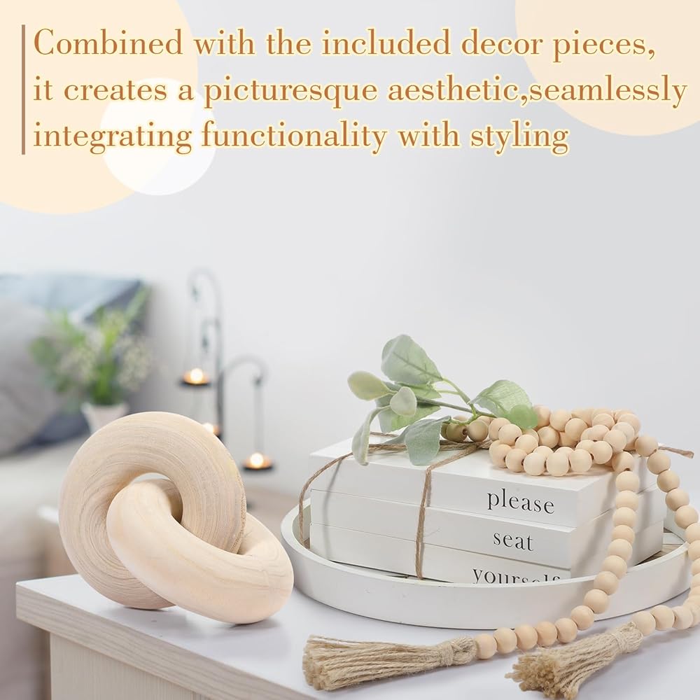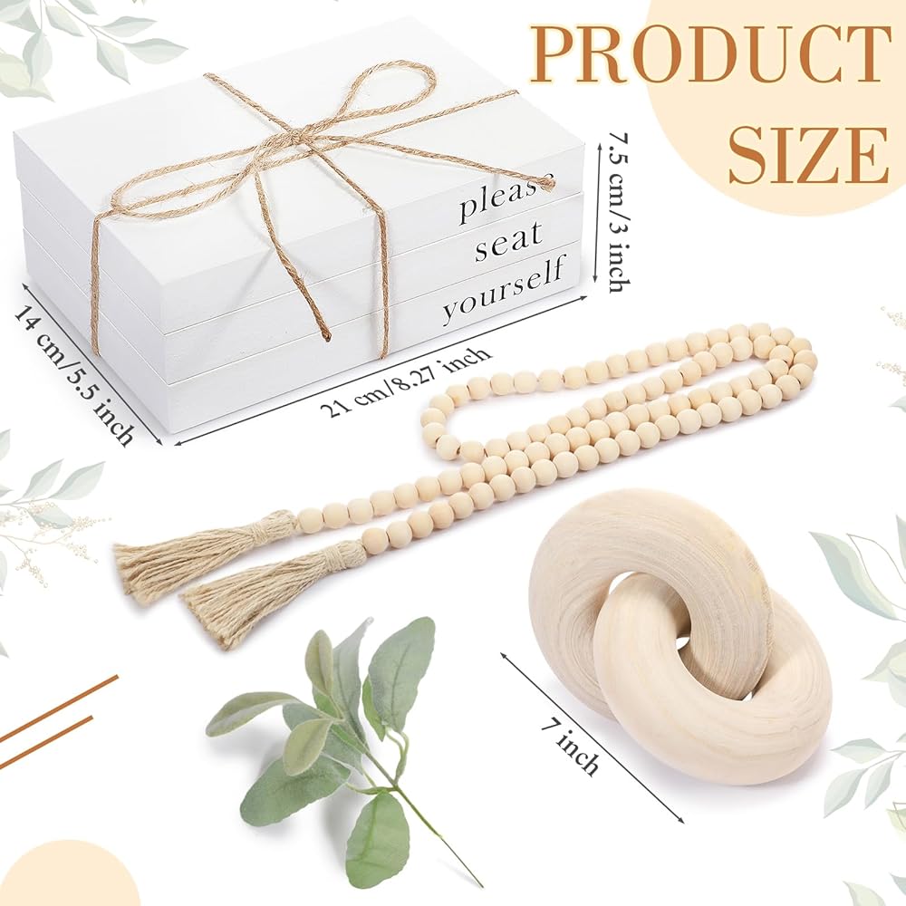 استخدامات متعددة: توفر كتب الديكور الخشبية لمنزل المزرعة مع جذع أذن الحملان الصناعية وديكور سلسلة خشبية وإكليل خرز خشبي إمكانيات غنية لتصميمك الداخلي؛ يمكن وضع كل قطعة على حدة أو دمجها معًا لإنشاء قطعة مركزية ساحرة أو لمسة زخرفية، مما يجلب جاذبية بصرية مختلفة