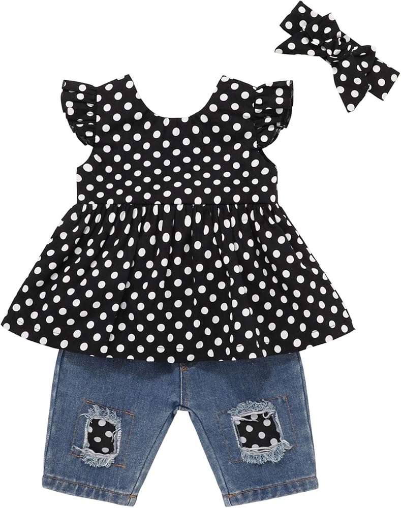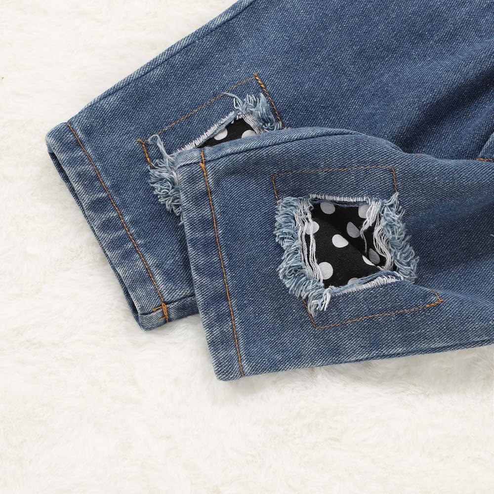 • تصميم عصري: تصميم علوي مكشكش وزهور مع بنطلون جينز ممزق، لطيف وعصري. نحن على يقين من أن طفلتك الصغيرة ستحب طقم البنطال المزين بالزهور ولن ترغب في خلعه.