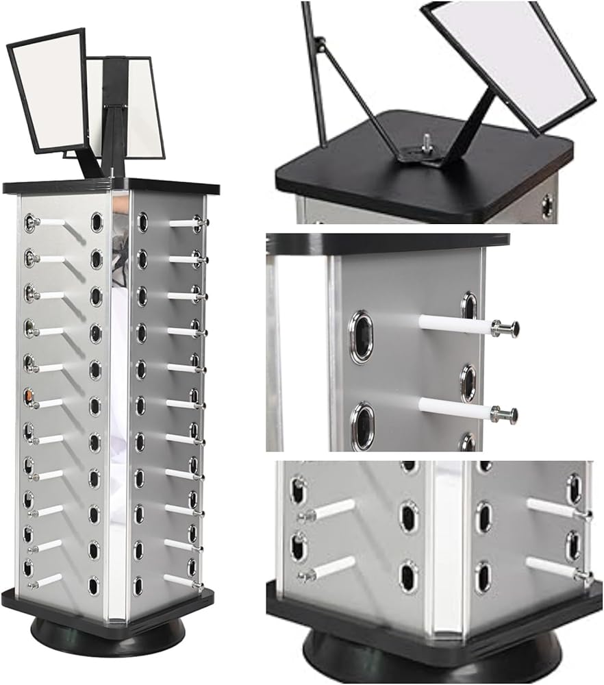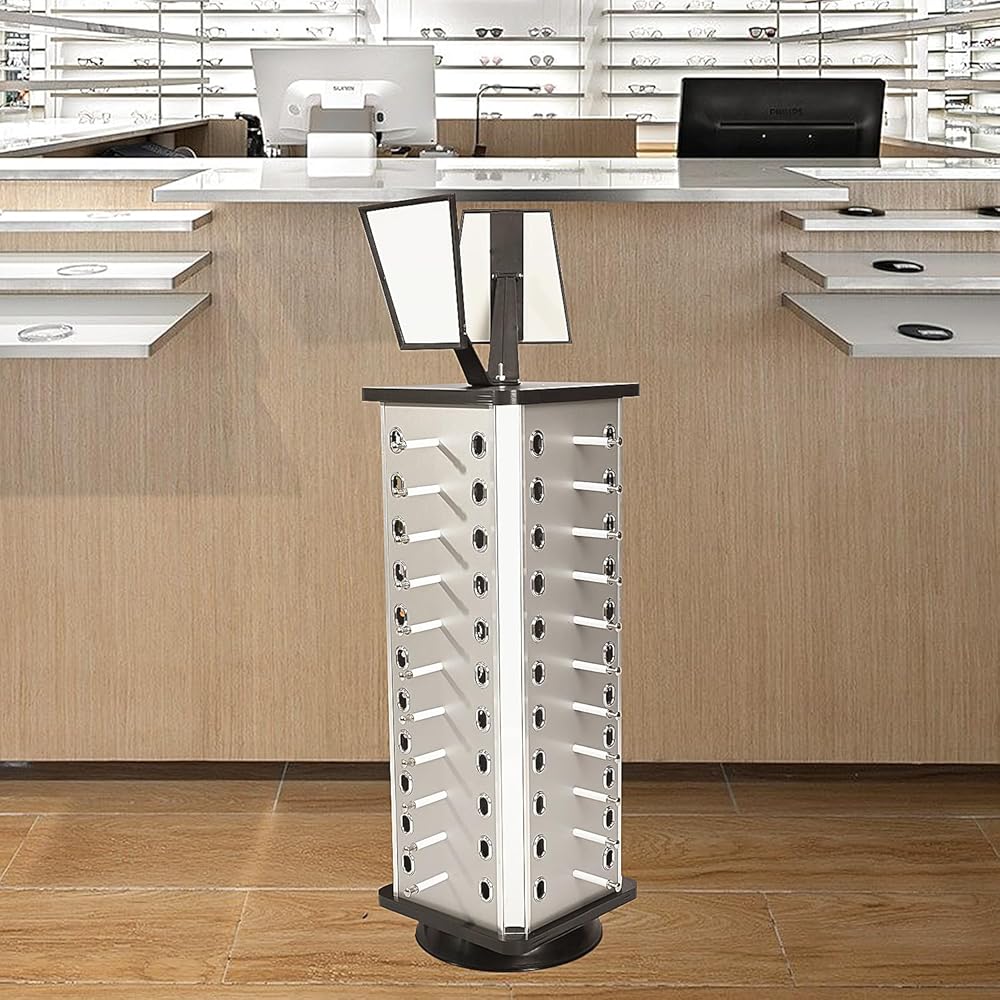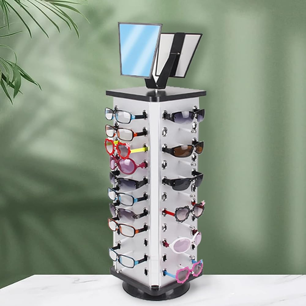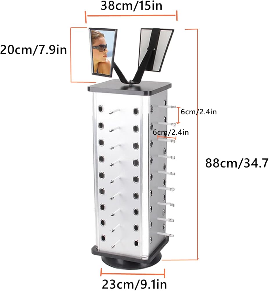 1. سعة كبيرة، يمكن أن تعرض 44 زوجًا في نفس الوقت. 2. مع وظيفة الدوران، يمكنك عرض نظارتك من أي زاوية. 3. مع مرآتين قابلتين للتعديل، فهي أكثر ملاءمة للعملاء الذين لديهم ارتفاعات مختلفة.