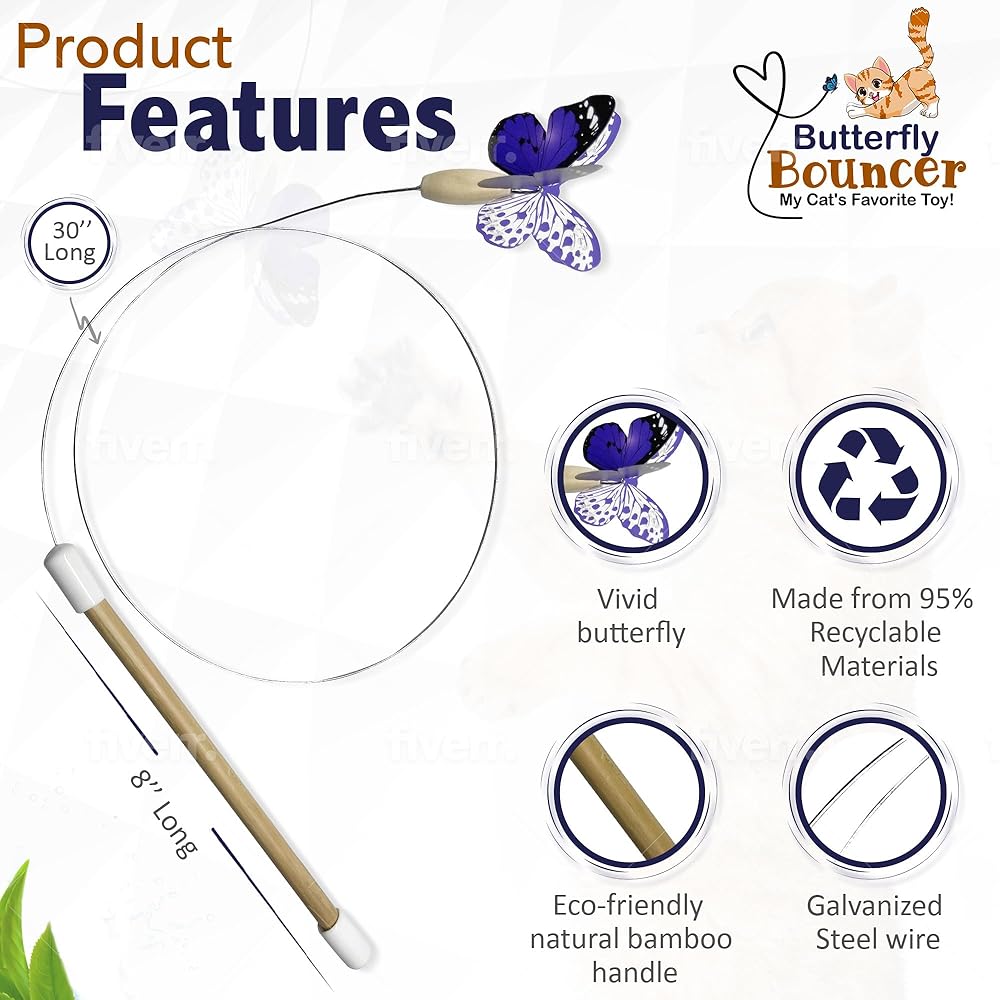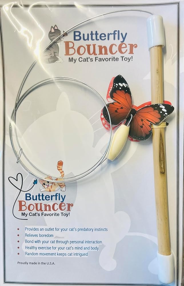 • What makes the Butterfly Bouncer unique and special It's made in the USA! ... Only cat toy with weighted butterfly (wood bead on butterfly end helps to mimic an actual butterflies flight) ... Eco-friendly design ... Made with 95% recyclable material ... Comfortable eco-friendly bamboo handle ... Invented and made by a cat lover in the USA ... Long bendable wire ... and much more! A quality product that your cat will love to chase and play with!