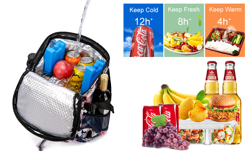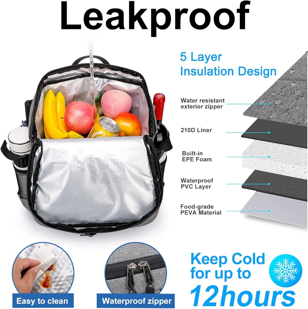 Insulated Backpack Cooler: This backpack cooler for women is made of water resistant exterior and zipper, leakproof interior. 5 layer insulation design makes the soft side portable cooler backpack can keep food or drinks cold for up to 12 hours