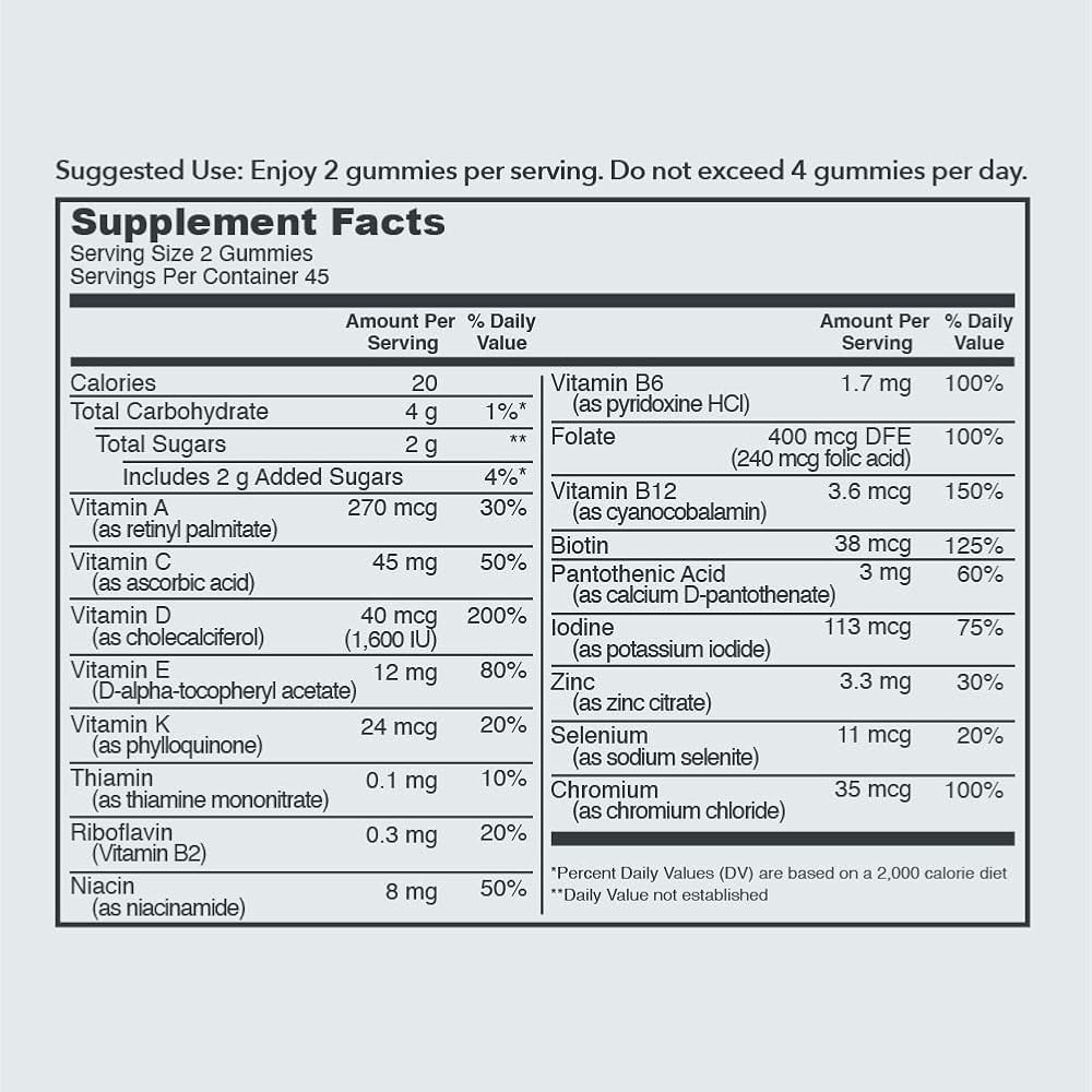 قضمة واحدة، فوائد متعددة ---- تحتوي هذه الفيتامينات متعددة المهام للنساء على فيتامينات بي لتعزيز الطاقة اليومية، وفيتامين سي والزنك، والسيلينيوم لصحة المناعة، والثيامين، والكروم، واليود يدعم عملية الأيض.