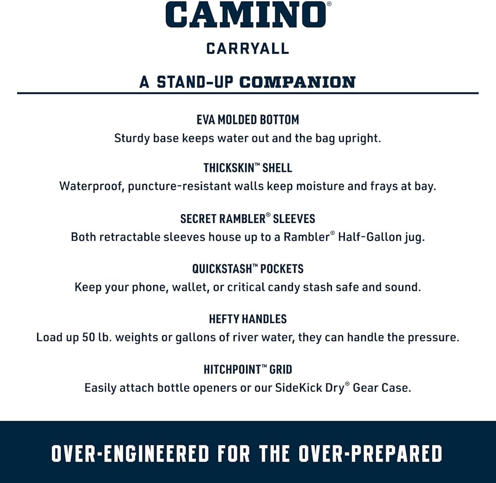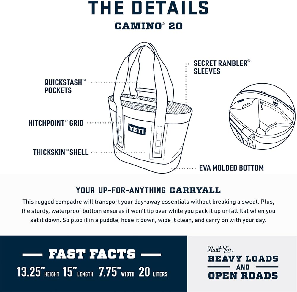 • الحجم والملحقات - من الخارج 13.25 بوصة ارتفاع × 15 بوصة طول × 7.75 بوصة عرض. الوزن الفارغ 2.9 رطل. تسوق Sidekick Dry أو YETI Bottle Sling لإكمال حمولة Camino الخاصة بك. يرجى ملاحظة: Camino ليس مبردًا