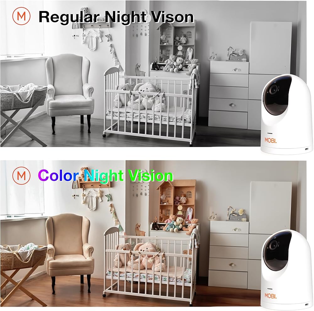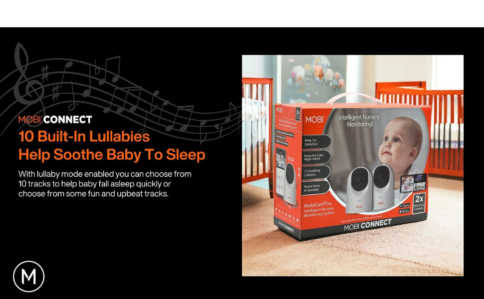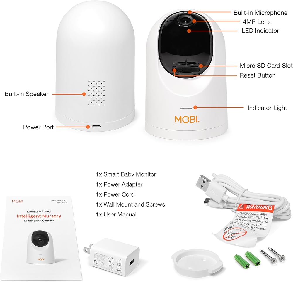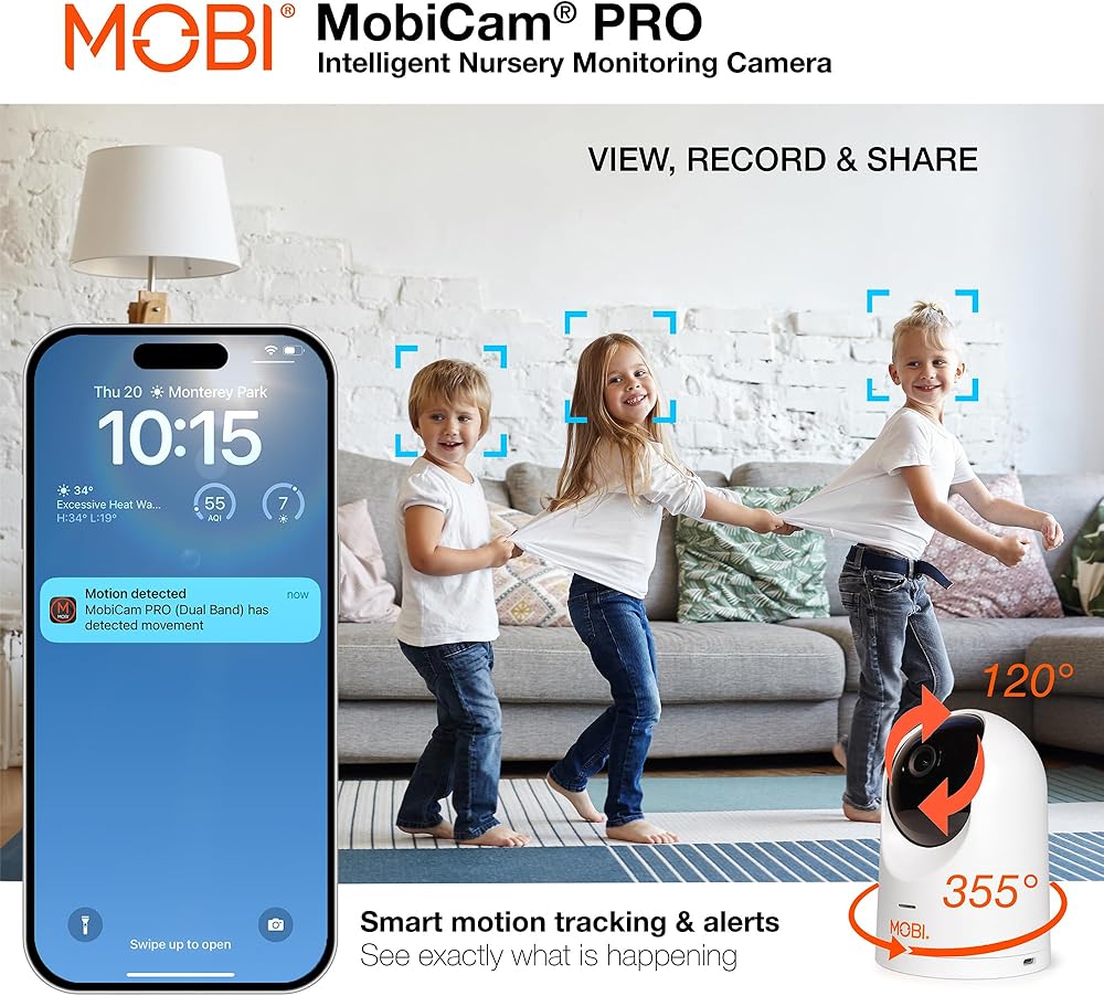 جهاز مراقبة الأطفال الذكي MobiCam PRO: دقة عالية كاملة، عموم وإمالة، رؤية ليلية ملونة، تتبع الحركة، 10 تهويدات، قراءات لدرجة الحرارة والرطوبة. يدعم التخزين السحابي وSD، متوافق مع التطبيقات الذكية
