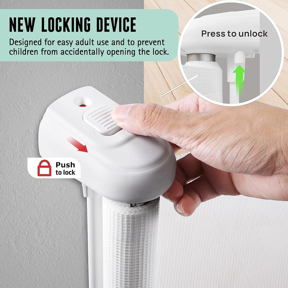 تصميم قابل للسحب التلقائي: تتميز هذه البوابة القابلة للسحب بوظيفة سحب تلقائي ويمكن أن تمتد إلى 55 انش عرضًا و34 انش ارتفاعًا. عند عدم الاستخدام، يمكن سحب البوابة الشبكية بالكامل لتوفير المساحة.