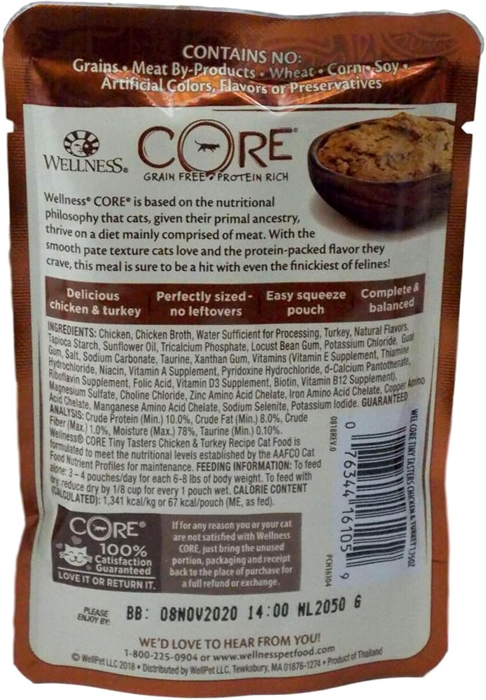 Wellness CORE Tiny tasters Grain Free single serve cat food pouches in 4 great flavors to try plus 2 cute interactive catnip toys for hours of play time.