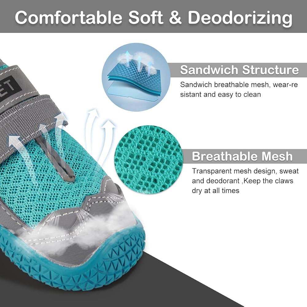 مريح وقابل للتنفس: قماش خفيف الوزن وناعم من الداخل يمكن أن يحمي أقدام كلبك من الاحتكاك والاحتكاك. النعل المطاطي المرن يمكن أن ينحني بسهولة، ولن يعيق حركة الجرو. شبكة هوائية منسوجة بإحكام تحافظ على الأوساخ والحطام خارجًا مع الحفاظ على الراحة والتهوية طوال اليوم. مصممة خصيصا لفصل الصيف.