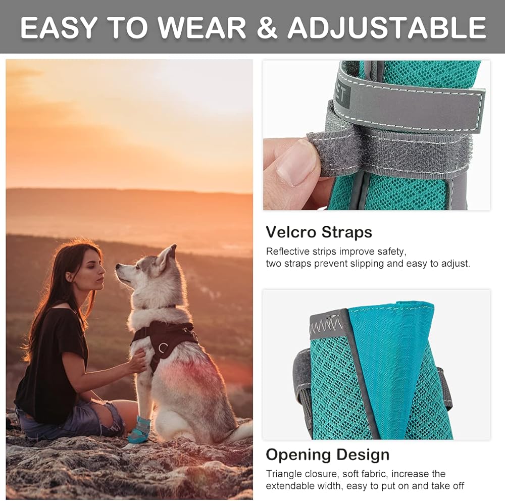 سهولة الارتداء والملاءمة المريحة: مع تصميم الخطاف والحلقة وفتحة علوية واسعة، من السهل ارتداء أحذية الحيوانات الأليفة أو خلعها. شريطان قابلان للتعديل من أجل تثبيت محكم، ومنع الانزلاق وتوفير إحكام مخصص لإغلاق آمن. يمكن أن يبقى الحذاء في مكانه حتى عندما يقوم الجرو بالجري أو المطاردة.