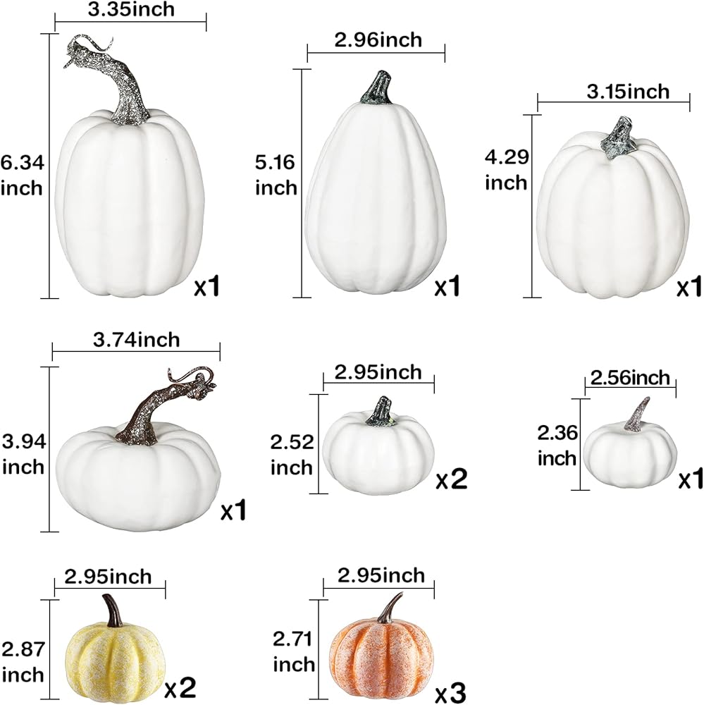 :1x Large pumpkin(White):3.35x6.34inch, 3x Medium pumpkin(White):2.96x5.16inch 3.15x4.29inch 3.74x3.94inch, 3x mini pumpkin(White):2.95x2.52inch, 2.56x3.36inch,4x mini pumpkin(Yellow&Orange):2.95x2.87inch