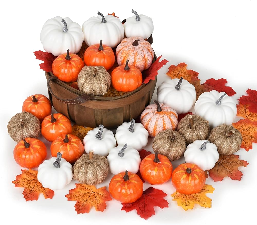 🎃28 قطعة بأحجام مختلفة من اليقطين الصناعي و50 قطعة من أوراق القيقب الصناعية، جميعها معبأة في حقيبة. زين منزلك بهذا اليقطين الصناعي لخلق ديكور خريف دافئ هذا الموسم مع هذا اليقطين الصناعي.