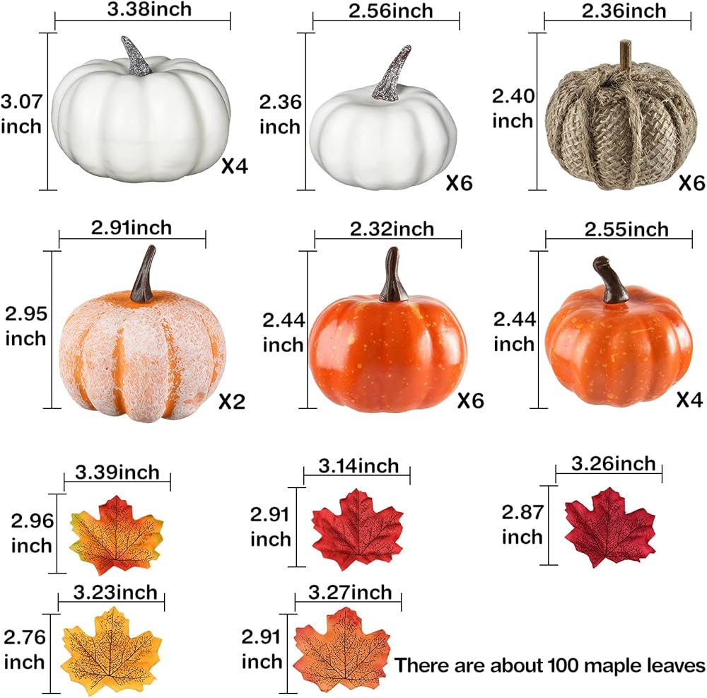 :4 × يقطين كبير (أبيض): 3.4 × 3.1 انش، 2 × يقطين متوسط (أبيض وبرتقالي): 2.91 × 2.95 انش، 10 قطع يقطين صغير (برتقالي)، 6 × يقطين صغير (خيش): 2.33 × 2.45 انش، 6 × يقطين صغير (أبيض): 2.55 × 2.36 انش. 50×50 مزيفة أوراق القيقب: 3.25 × 2.9 انش
