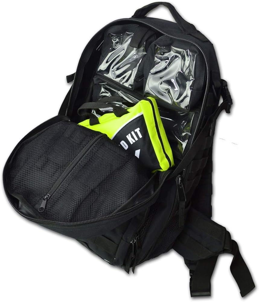 A must-have for schools, sports teams, hiking, biking, camping, travel and other family activities. Our 104 piece first aid kit contains a healthy assortment of first aid and survival supplies necessary to deal with a number of emergency situations. It's small enough to keep in your glove compartment, backpack or even a purse so it's out of your way until you need it. Don't let the size fool you though - we didn't skimp on the supplies. You won't believe all the items that we fit in this bag. To ensure everything is organized, we have pre-arranged the items for you in four separate transparent compartments within the bag - each with a velcro closure to keep them in place. The bag is easily identifiable and made of hi-vis fluorescent yellow fabric on top, with a semi-reflective piping across the front with the words "FIRST AID KIT" printed in all caps below. In addition, the bag features dual zippers that can be tagged together to prevent tampering and identify, when and if, the kit has been opened. This is helpful for companies that may have multiple kits in service in the field and want to keep them fully stocked at all times. The following is a full list of supplies and quantities in each kit: Fire Starter and Flint (1), Paracord (1), Medical Gloves (1pr), Triangle Bandage (2), Sting Relief Pads (4), Sewing Kit (1), Bandage Shears (1), Safety Pins (4), Rescue Whistle (1), Razor Blade (1), Rain Poncho (1), Moleskin Blister Relief Pad (1), Metal Tweezers (1), Glow Stick (1), Sterile Gauze Pads (3), Medical Tape 1/2" (1 roll), Carabiner (1), LED Flashlight (1), Emergency Foil Blanket (1), Elastic Conforming Bandage (1), CPR Facemask (1), Cotton Tip Applicator (10), Compass (1), Instant Cold Compress (1), Butterfly Closure Strips (6), Antiseptic Cleansing Wipes (6), Alcohol Prep Pads (10), Standard Adhesive Bandage (25), Adhesive Knuckle Bandage (3), Adhesive Fingertip Bandage (3), Extra Large Adhesive Bandage (4), Abdominal ABD Trauma Bandage (1).