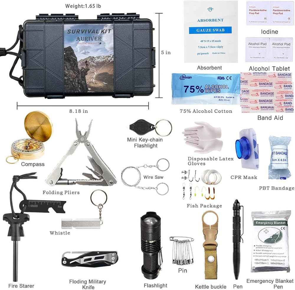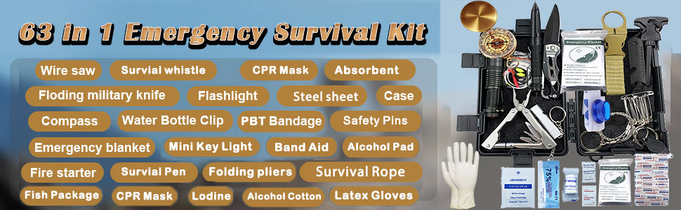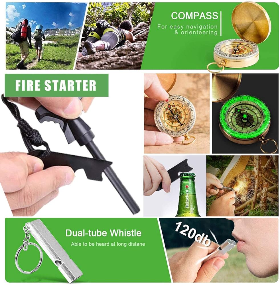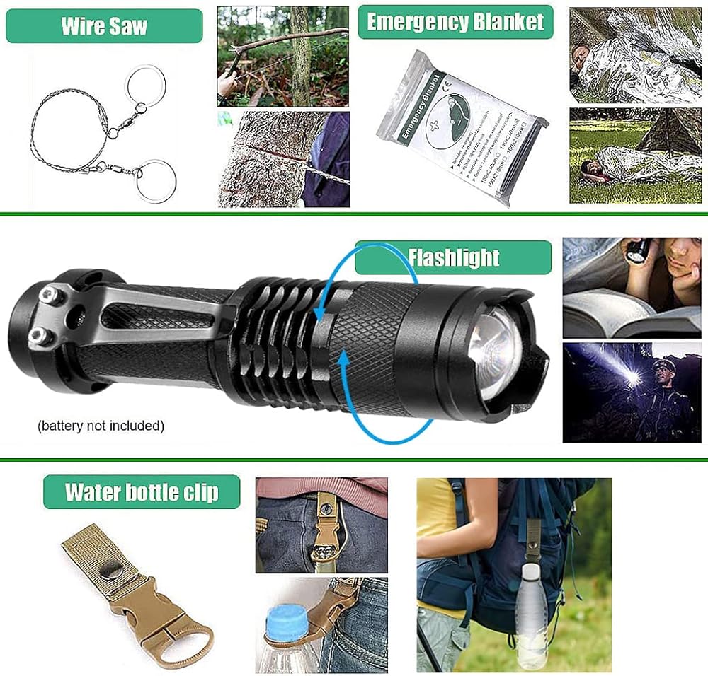 • 【مجموعة النجاة للإسعافات الأولية 63 في 1】تتضمن مجموعة النجاة في حالات الطوارئ ما يلي: بوصلة، ومنشار سلكي، ومشبك زجاجة مياه، وبطانية طوارئ، ومكشطة حجر الصوان، ومصباح يدوي (البطارية غير متضمنة)، وصفارة، وأداة متعددة الاستخدام، وصندوق مقاوم للماء، وأدوات صيد ، ضمادة، وسادة الكحول الخ.