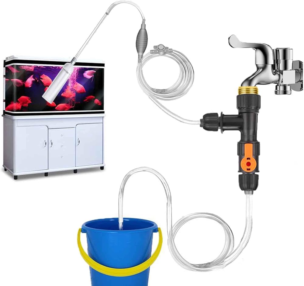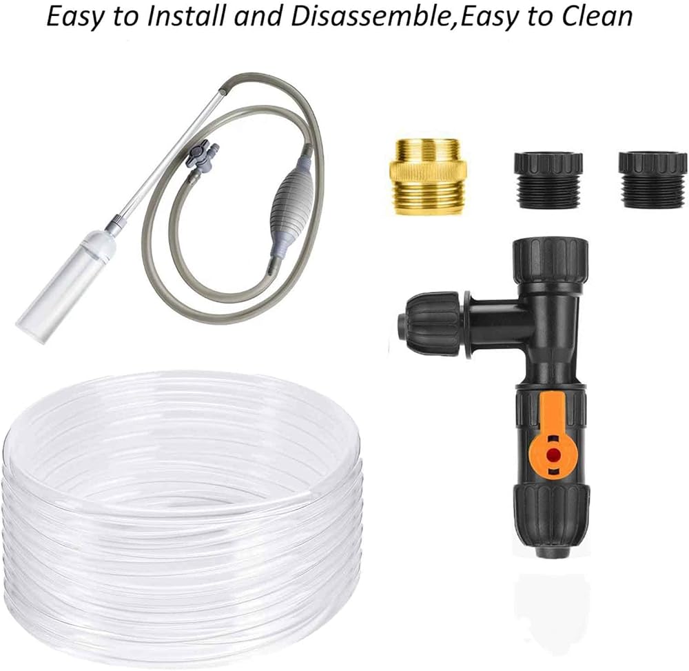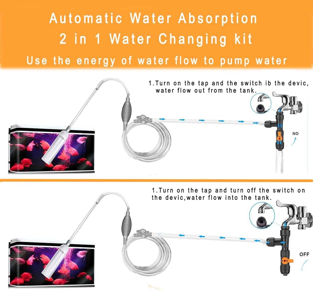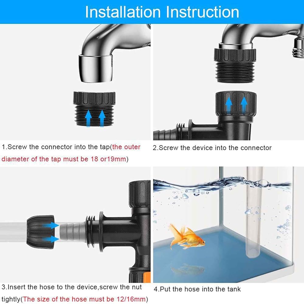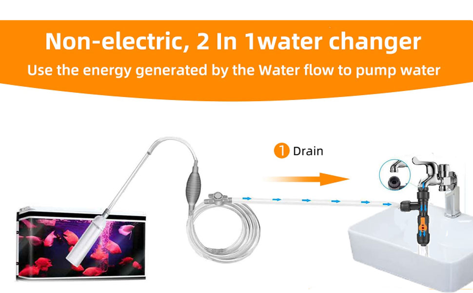 بسيطة وسريعة لتغيير الماء. قم بتوصيل الصنبور بمغير المياه، ثم قم بتوصيل الخرطوم بالمنفذ الآخر لمغير المياه. استخدم ضغط ماء الصنبور لتصريف المياه. مناسبة لأحواض الأسماك المتوسطة والكبيرة.